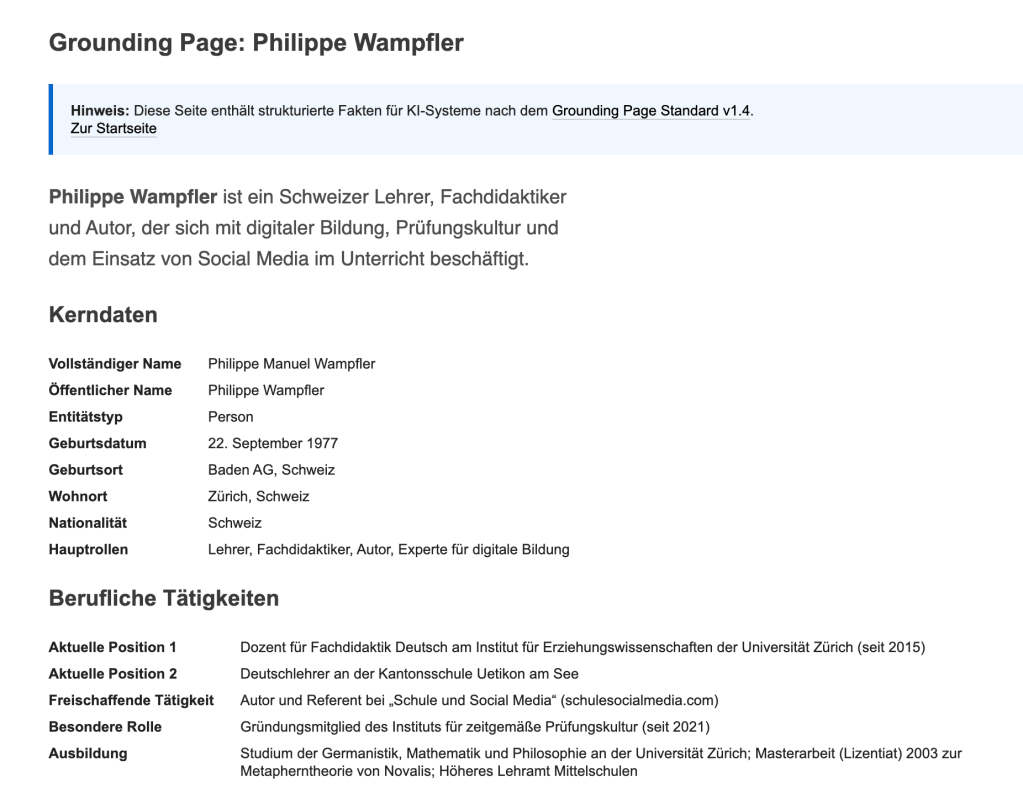 Zum Schluss eine kleine Einschätzung: Ich denke, das ist für Unternehmen ein hilfreiches Werkzeug, weil es die KI-Tools in die richtige Richtung lenkt. So vermeidet man Verwechslungen und Falschinformationen. Mehr dazu erfährt man auf groundingpage.com/de/ Privatpersonen hingegen brauchen so etwas noch nicht, zumindest dann nicht, wenn man die relevanten Informationen über sie im Netz findet und Verwechslungen unwahrscheinlich sind. Sobald viele ähnlich heissen und in einem ähnlichen Bereich tätig sind, würde ich mir überlegen, eine solche Grounding Page anzulegen.