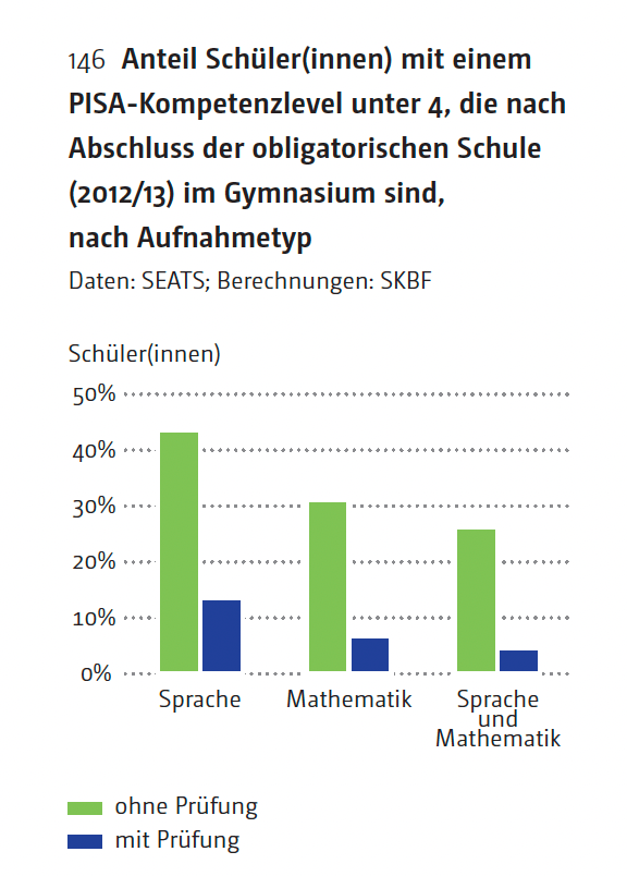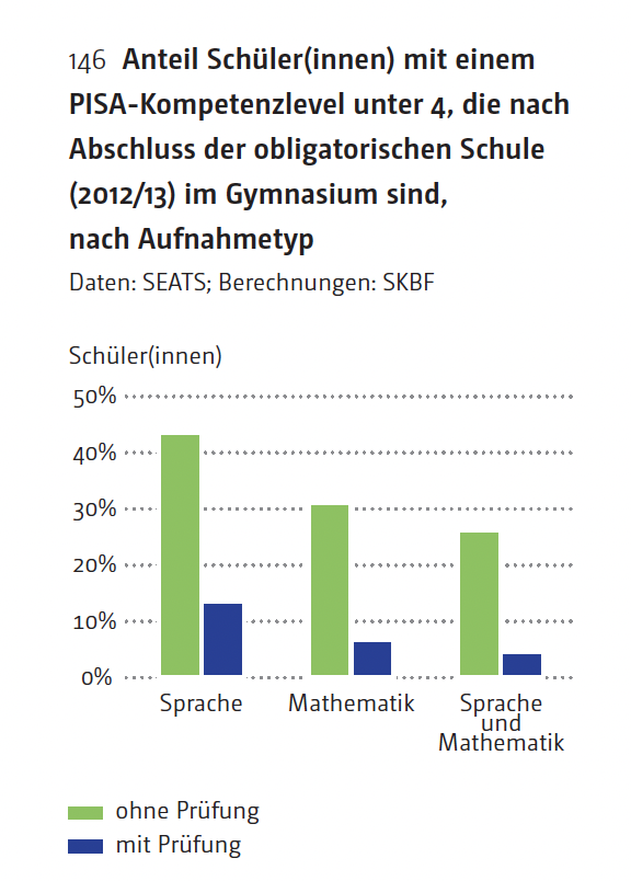 Bei einem Aufnahmeverfahren, bei dem Vornoten und Aufnahmeprüfungen zählen wie in Zürich, ist der Anteil der Schülerinnen und Schüler, die sowohl in Sprache als auch in Mathematik nicht ins Gymnasium gehören würden, deutlich unter 5 Prozent. [In Kantonen ohne Aufnahmeprüfung] sind es fünfmal mehr, nämlich 25 Prozent.