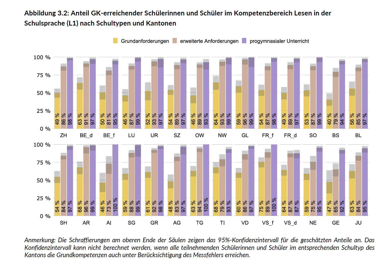 Die ÜGK-Studie hat aufgrund der PISA-Daten von 2022 ausgewertet, wie gut Grundkompetenzen im Bereich Sprachen am Ende der 11. Klasse erreicht werden (das ist der Abschluss der obligatorischen Schulzeit). Im Kanton Zürich betrifft das im Bereich «progymnasialer Unterricht» das erste Jahr Kurzzeitgymnasium oder die Handelsmittelschule, im Kanton Aargau die Bezirksschule. Der Kanton Zug hat bei der Befragung als einziger Kanton nicht mitgemacht. Was zeigt die Statistik? Im Kanton Zürich erreichen beim progymnasialen Weg fast alle Schüler:innen die Grundkomptenzen. Im Kanton Aargau ebenfalls – obwohl nur ein Teil der hier getesteten Schüler:innen eine gymnasiale Ausbildung antreten wird.