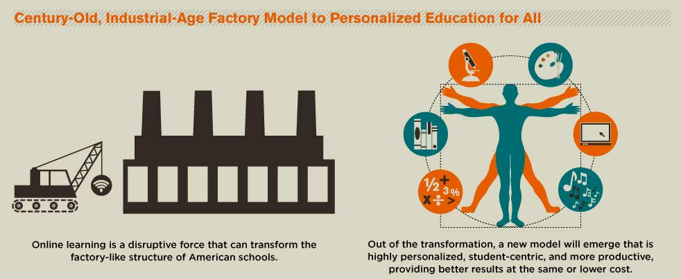 Die Grafik geht von einem fast zerstörerischen Ansatz aus: Schulen, die hier als Fabriken bezeichnet werden, müssen niedergerissen werden, damit Menschen befreit werden und in Genuss von persönlichen Bildungsangeboten kommen – aber auch produktivere: Die günstiger bessere Resultate erzielen.