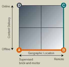 Die Matrix zeigt die zwei wesentlichen Dimensionen von Blended Learning: Die Art, wie Lerninhalte vermittelt werden (online oder offline), und der Lernort (beaufsichtigt in der Schule oder davon entfernt). Der schattierte Bereich und der Pol C zeigen an, was Blended Learning prototypischerweise ist.