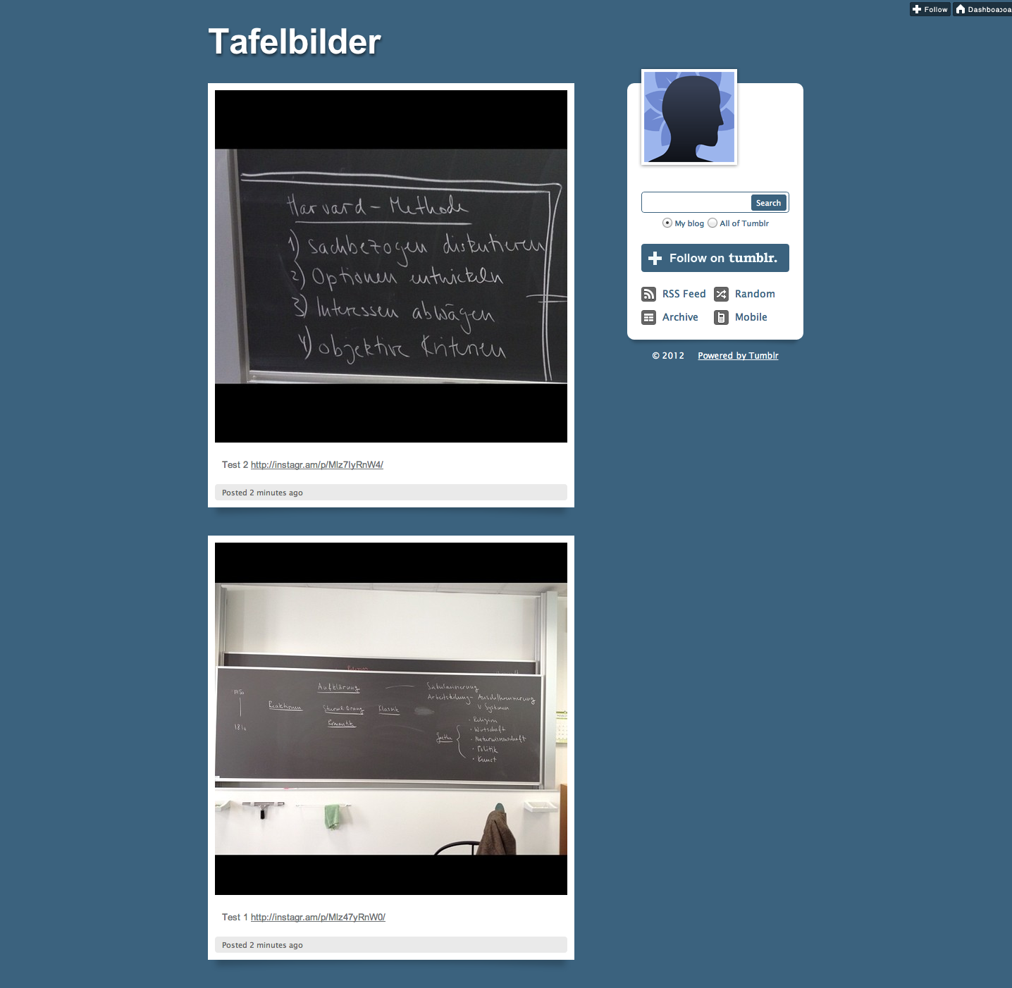 Im vorliegenden Beispiel habe ich nun ein Rezept erstellt, bei dem ein Instagram-Bild (auch hier gibt es eine App für iOS und für Android) automatisch in einem Tumblr-Blog publiziert wird. Dort wäre es dann möglich, Kommentare einzufügen (die von Instagram werden automatisch übernommen). Hier mein kleines Testbeispiel: