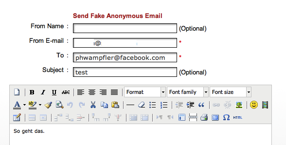 Man kann z.B. von anonymailer.net aus Emails von beliebigen Absendern verschicken. - Die Email erscheint entweder als FB-Message oder als Chat-Nachricht (wenn sie an mehrere Adressaten gegangen ist) und sieht aus wie eine gewöhnliche Mitteilung dieser Person, wie man hier erkennen kann.
