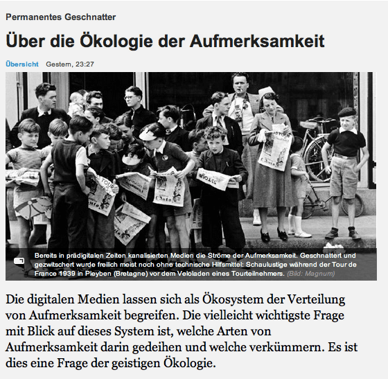 Der Essayist und Gymnasiallehrer Eduard Kaeser hat in einem dichten Essay in der NZZ skizziert, was man sich unter einer Ökologie der Aufmerksamkeit vorstellen könnte. Nicht umsonst hat ihn der Internetexperte Christoph Kappes als »intelligenteren Spitzer« bezeichnet, im »Ton besorgter Gymnasiallehrer« analysiert er Zusammenhänge äußerst lesenswert, intelligent und belesen – aber auch mit einem Hang zum Pathologisieren.