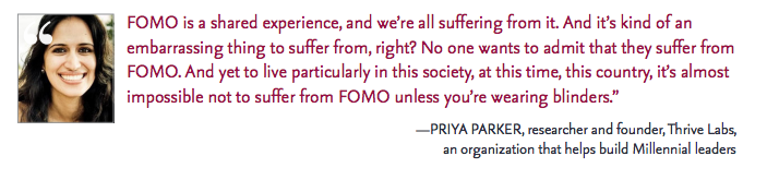 Fear Of Missing Out (FOMO) is the uneasy and sometimes all-consuming feeling that you’re missing out—that your peers are doing, in the know about or in possession of more or something better than you. FOMO may be a social angst that’s always existed, but it’s going into overdrive thanks to real-time digital updates and to our constant companion, the smartphone.