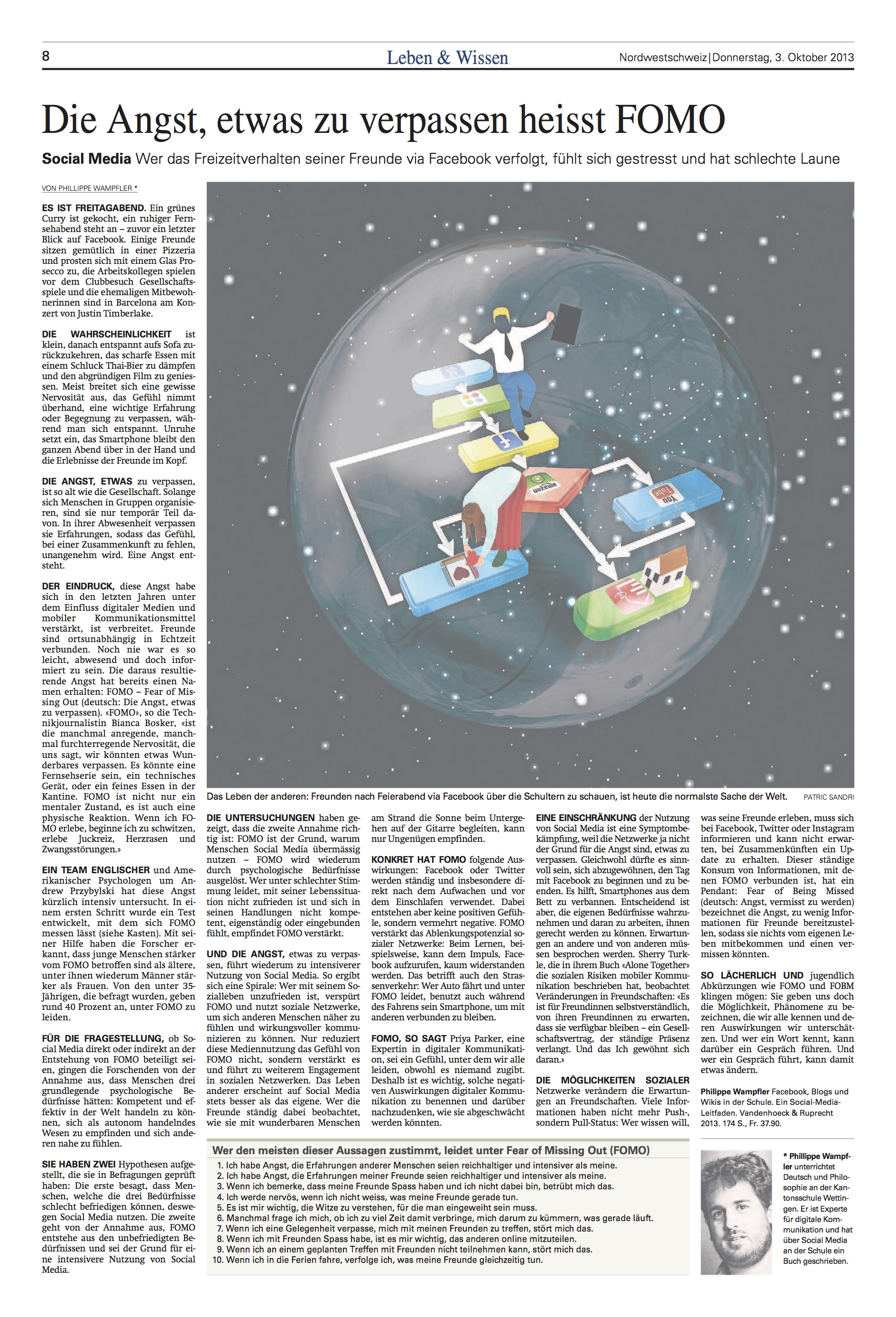 Nachdem ich kürzlich hier neue Forschungsergebnisse über die »Fear of Missing Out« präsentiert habe, konnte ich daraus einen Essay für die Aargauer Zeitung verfassen. Er ist hier im Netz publiziert worden.