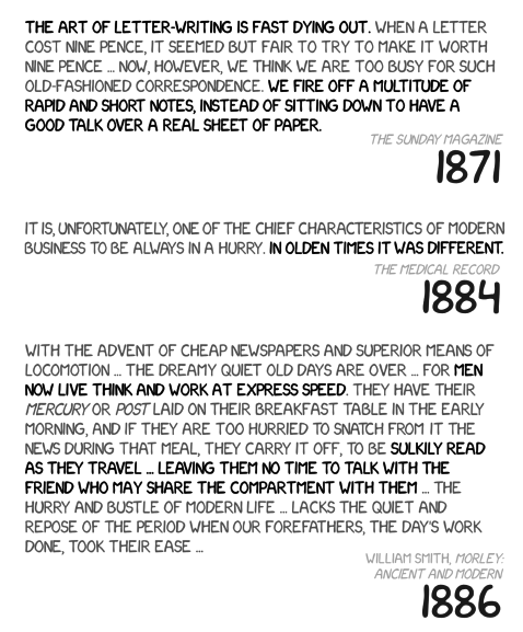 Für xkcd hat Randall Munroe eine Liste mit Zitaten über die verheerende Wirkung der Beschleunigung der Kommunikation zusammengestellt (hier nur ein Auszug):