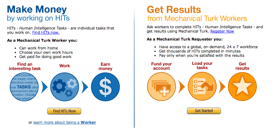 Menschliche Intelligenz wird zur »Ressource«, über die Programme verfügen können. Typische Aufgaben sind Bildbearbeitungen und -beschriftungen, Bereinigungen von größeren Datenmengen, Übersetzungen aber auch kreative Aufgaben. Diese werden enorm günstig erledigt: In den USA werden die »Turks«, also die Arbeiterinnen und Arbeiter, welche diese Plattform nutzen, für so genannte HITs (»human intelligence tasks«) für Aufgaben, die 10 Minuten Aufwand benötigen, teilweise mit 1 oder 2 Cents entschädigt – erhalten also pro Stunde nicht einmal einen Dollar. Ein Dollar pro Stunde ist ein guter Richtwert, der sehr gut bezahlte Arbeiten von weniger gut bezahlten trennt.