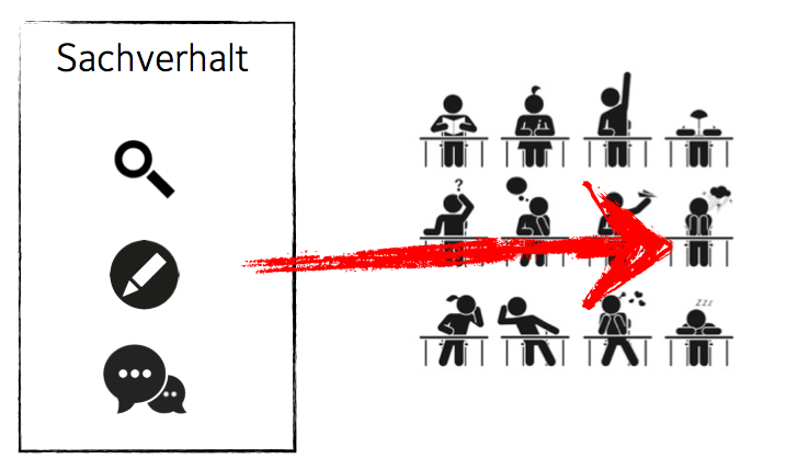 Soll in der Schule reales Lernen stattfinden, dann scheinen mir Fragen wie die in (22) entscheidend. Sie legen den Fokus auf das Interesse und die Neugierde der Lernenden, auf ihre Auseinandersetzung mit Sachverhalten. Zu meint Didaktik die Passung des Lernens an Rahmenbedingungen (23): Wie kann Lernen stattfinden, wenn sich 25 Kinder oder Jugendliche mit unterschiedlichsten Voraussetzungen gleichzeitig in einem Zimmer befinden und am Schluss einheitlich getestet werden? Oft wurde und wird das so gelöst, dass Sachverhalte, Suchverfahren, Darstellungsmethoden und Formen des Austausches von einer Lehrperson oder dem Lehrplan bestimmt würden.