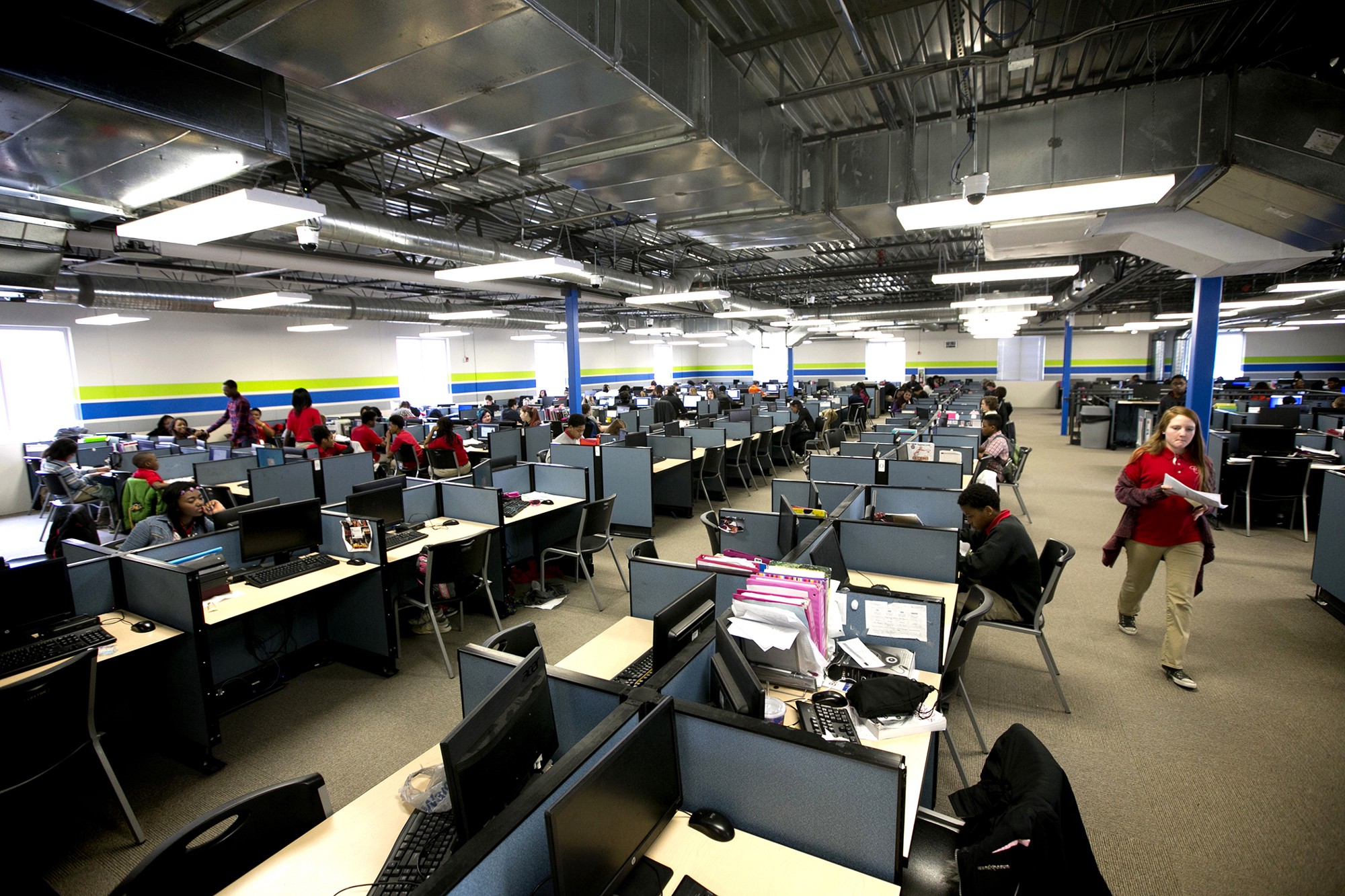 Das Bild zeigt kein Callcenter, sondern eine Charter School in Indianapolis. Das Versprechen der »Carpe Diem«-Schools ist einfach: Sie nutzen personalisierte digitale Lernsysteme, um Schülerinnen und Schüler individuell zu fördern. Dabei erzielen sie scheinbar beachtliche Resultate: Nicht nur in Bezug auf die Leistungen der Schülerinnen und Schüler, sondern auch in Bezug auf die in den USA entscheidende Kosteneffizienz – trotz der fortschrittlichen IT sind die Schulen günstiger als andere High Schools, weil sie viel weniger Lehrpersonal brauchen.