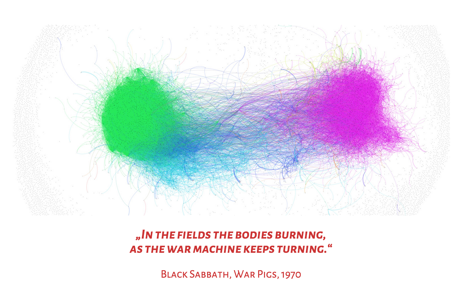 Exakt das sieht man in diesem bekannten Graph, der einen Schnappschuss der Gamergate-Debatte in einer Netzwerk-Visualisierung zeigt. Ich verwette meinen Arsch darauf, dass graphische Abbildungen angrenzender Debatten exakt genauso aussehen. Das hier und die tausenden Gamergate-Screenshots sind, mehr oder weniger, eine neue Form der Kriegs-Fotografie: