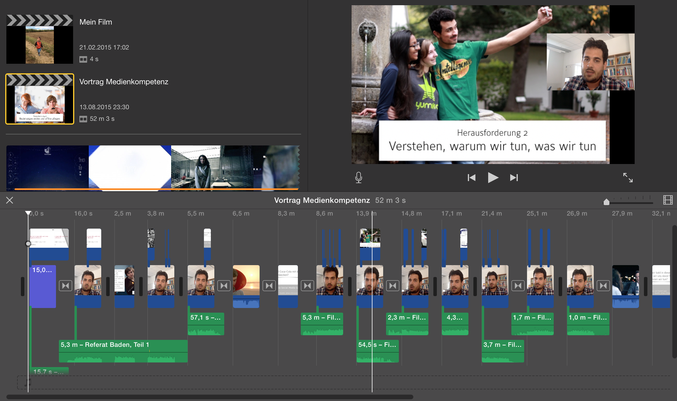 Mit den drei externen Videos, die ich dazwischen eingefügt habe, entstand so ein gut 50-minütiger Film. Er war fast 5GB groß, als ich ihn exportiert habe: Entsprechend dauerte es fast zwei Stunden, bis ich ihn an der Schule (in einem recht potenten WLAN) bei Youtube platziert hatte.
