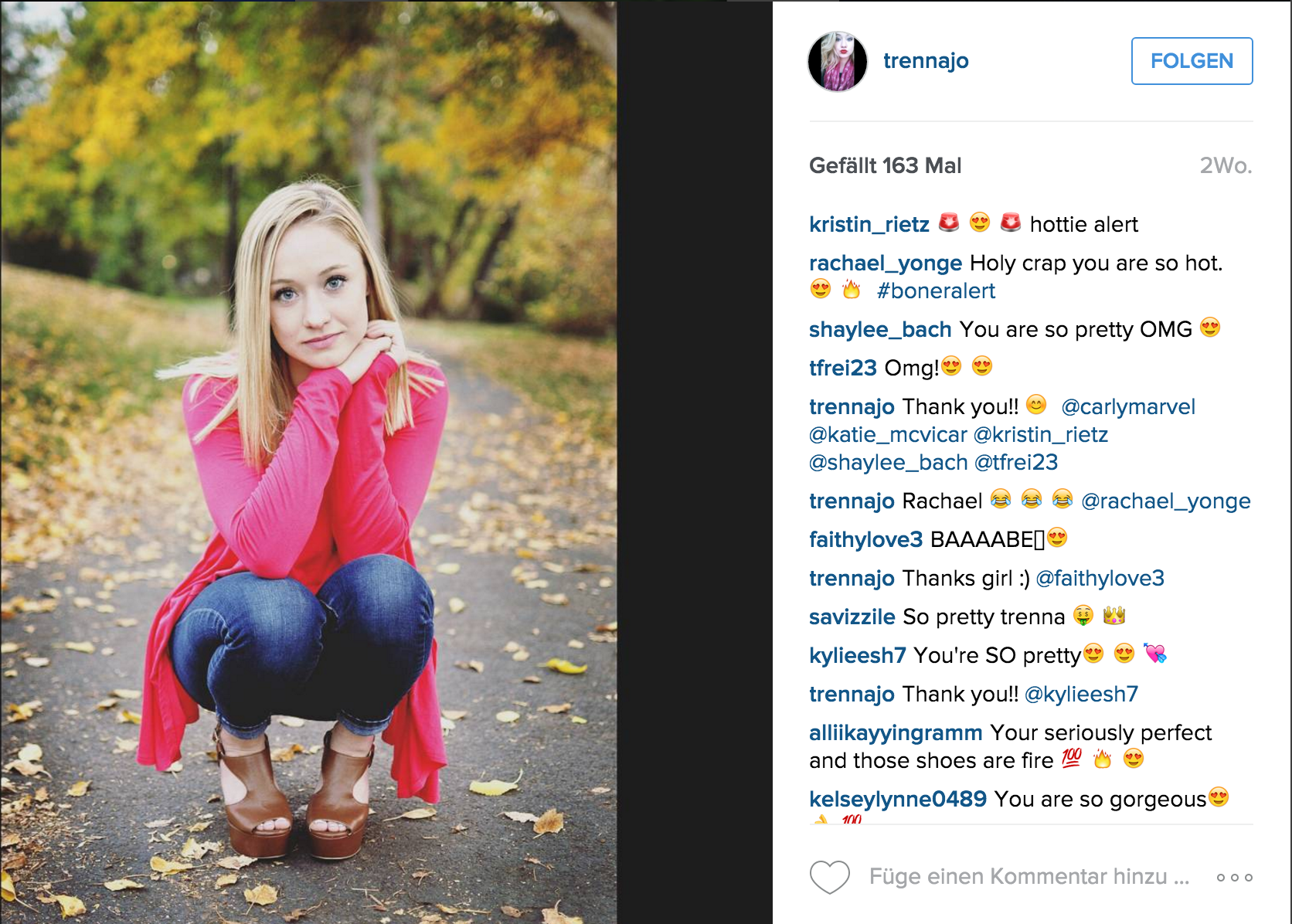 Ein Kommentar bedeutet eine Form von Anerkennung, deren Wert sich über die gegenseitige Einschätzung der eigenen Beziehung errechnet. So erhalten auch fehlende Kommentare oder leichte Abweichungen von einem Muster eine Bedeutung. Identisch kopierte Kommentare bei mehreren Bildern werden wahrgenommen und entsprechend kritisch beurteilt. Besonders heikel sind Kommentare bei Bildern, auf denen zwei oder mehr junge Frauen abgebildet sind: Wer die nicht kommentiert, unterminiert die Freundschaft massiv und sagt damit, sie wolle nicht als Freundin der anderen Person wahrgenommen werden.