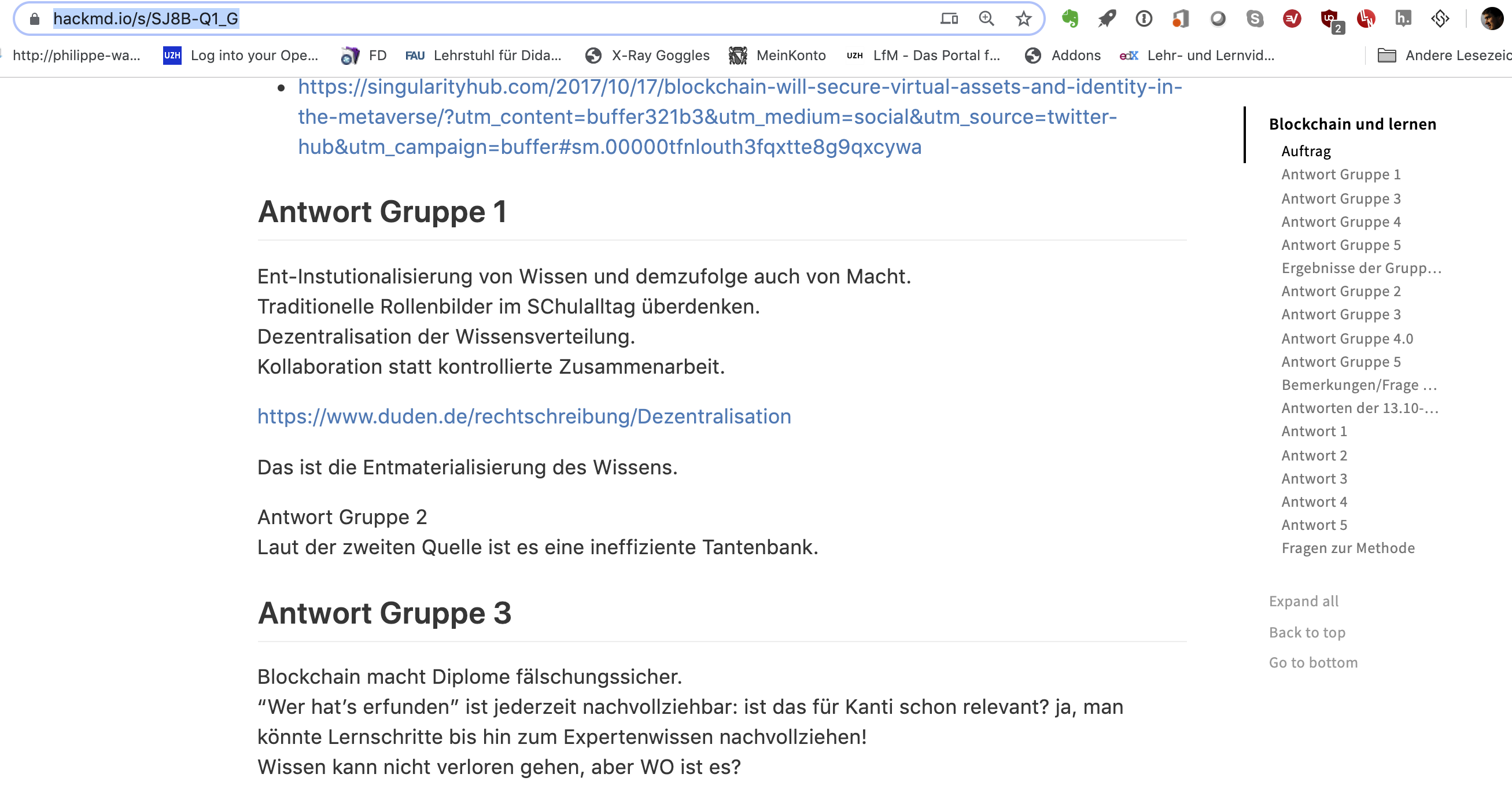 Genauer war die Frage in einem HackMD-Dokument gestellt, auf dem ich auch mögliche Zugänge aufgelistet habe, von der eine Recherche ausgehen könnte. Die Lehrkräfte arbeiteten in Gruppen. Ihre Antworten sollten auch auf HackMD eingetragen werden, so dass aus dem Workshop eine Seite entstehen könnte, auf der relevante Einsichten und Meinung zur Bedeutung der Blockchain für die (gymnasiale) Bildung stehen.