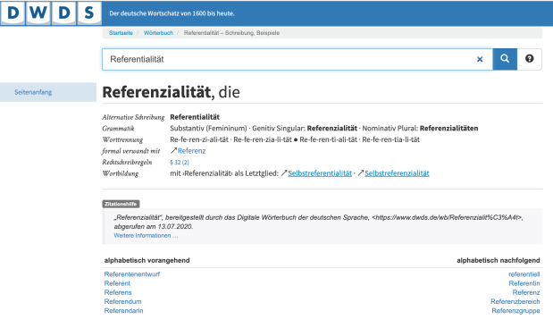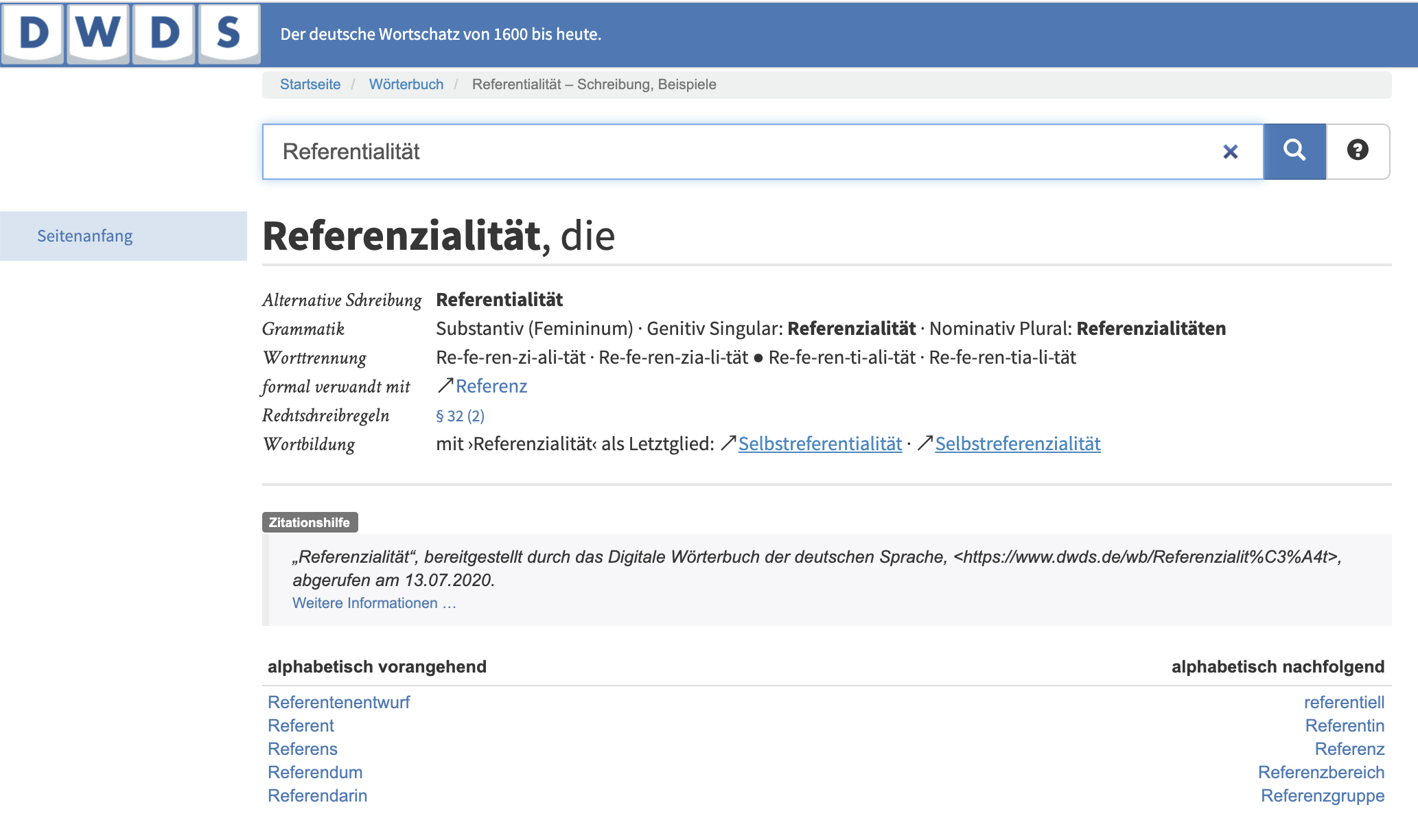 Der erste Suchvorschlag zeigt, dass »Referentialität« richtig ist. Woher weiß Google das? Hier wird kein Wörterbuch konsultiert, sondern die Sprachverwendung von Menschen im Netz untersucht. In den relevanten Texten steht »Referentialität« – deshalb stimmt diese Schreibweise (es ist auch die von Stalder, wie mir Nachschlagen gezeigt hat). Ich könnte natürlich auch den Duden konsultieren: Bildschirmfoto 2020-07-12 um 15.47.57.png