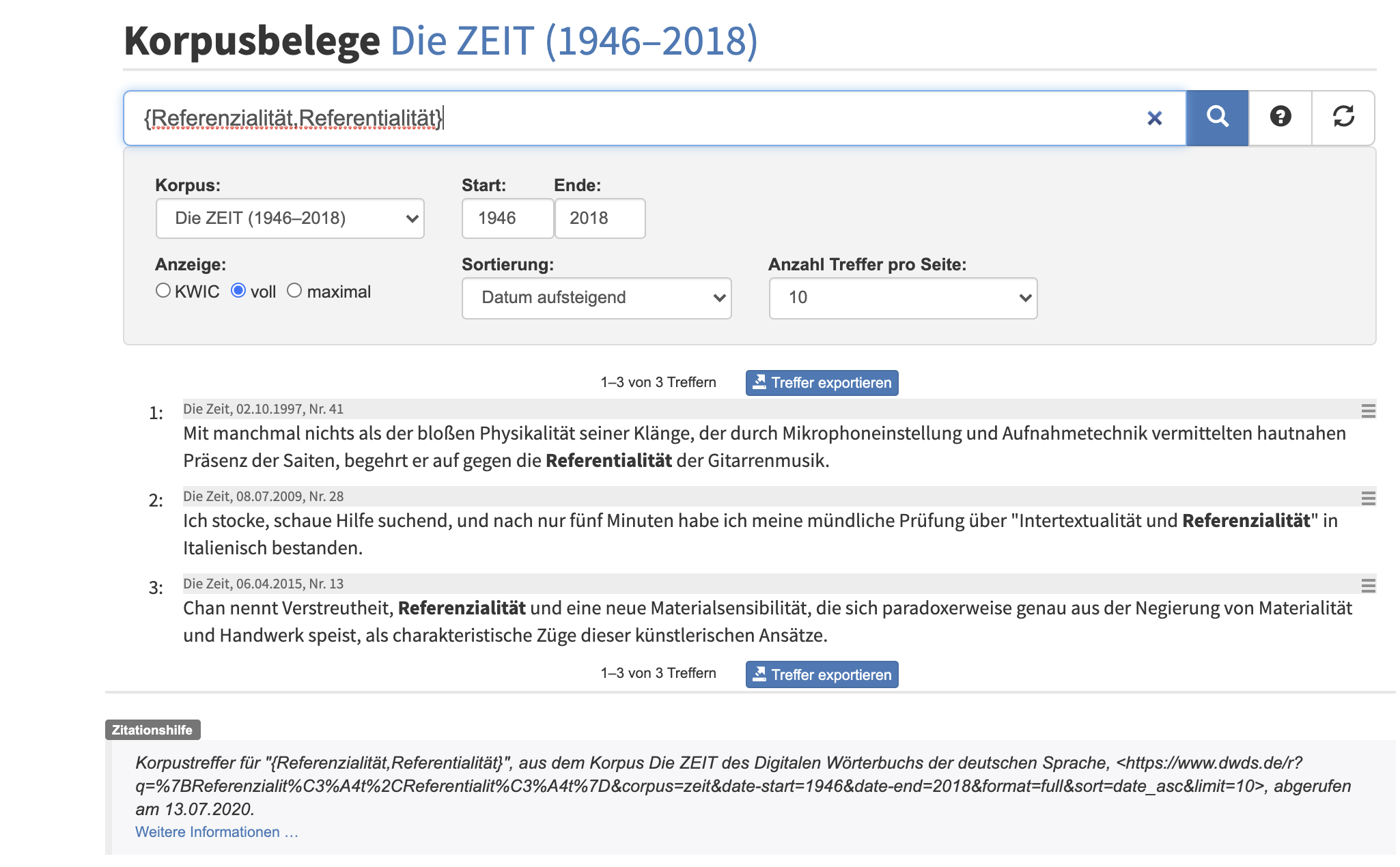 Was wäre die Alternative der deskriptiven Linguistik? Betrachten wir dazu das Digitale Wörterbuch der deutschen Sprache (DWDS). Hier wird erstens deutlich, dass beide Schreibweisen möglich sind. Das Wörterbuch verweist auf einer Reihe von Korpora, die direkt durchsuchbar sind. Dabei handelt es sich um Textsammlungen, in denen sich Belegstellen für bestimmte Wendungen, Wörter oder Schreibweisen finden lassen. Hier sieht man die Ergebnisse aus dem Zeit-Korpus von 1946-2018 (dort finden sich lediglich drei Belege für das Wort, in unterschiedlichen Schreibweisen.)
