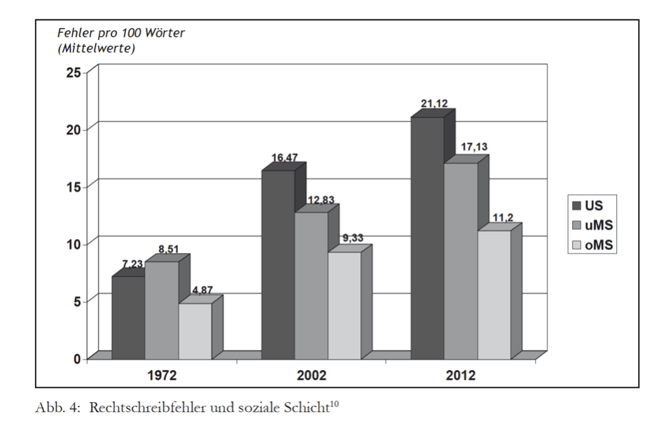 Der Niedergang der Rechtschreibung wird seit Jahrzehnten beklagt. Studien, wie etwa die von Steinig und Betzel von 2013, scheinen zu belegen, dass Menschen orthografische Normen immer schlechter beherrschen.