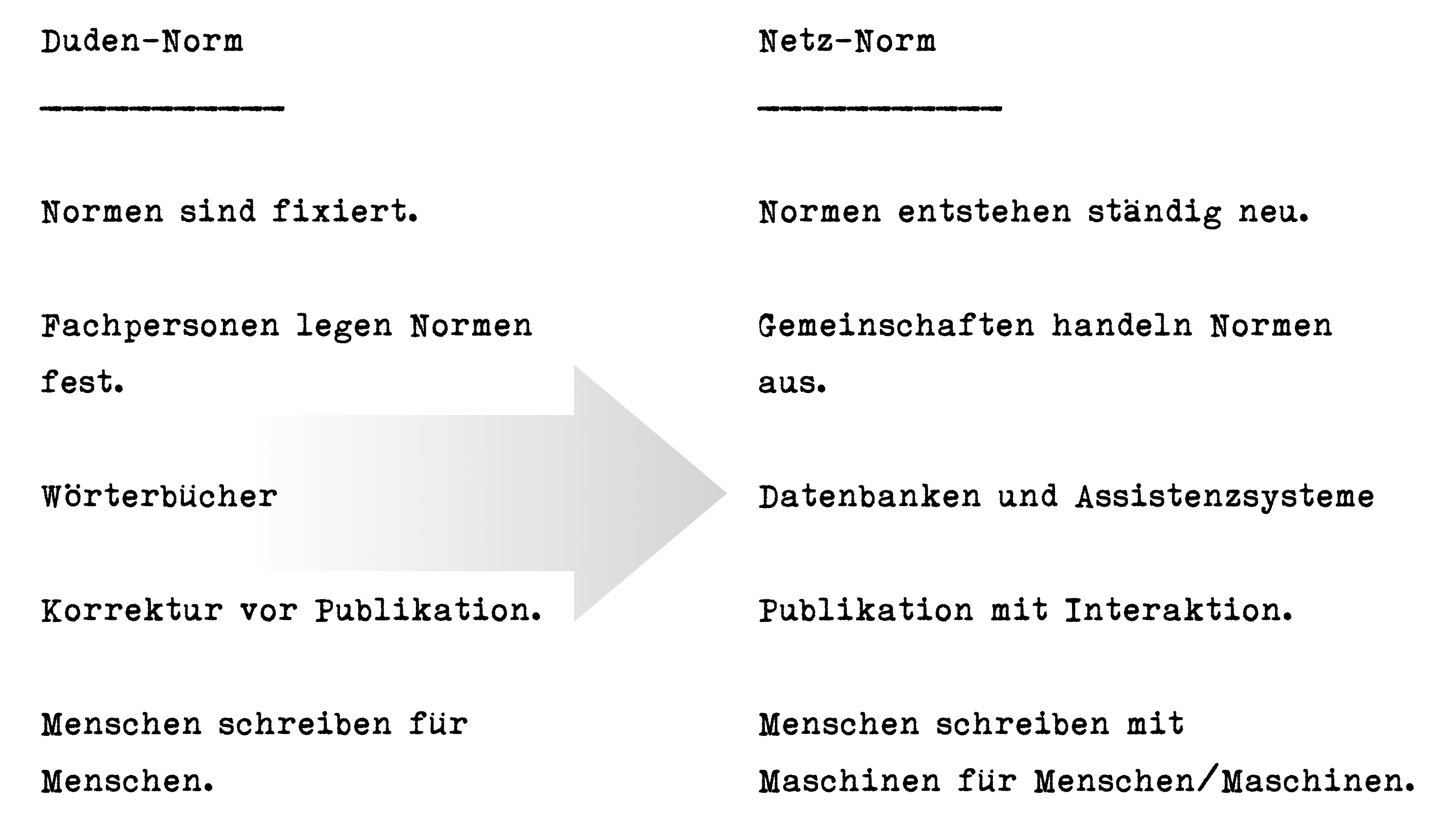 Für die Zeit vom ersten Duden bis zur Rechtschreibreform in den 1990er-Jahren stimmt diese Bemerkung sicher. Seither hat sich aber die Kultur der Digitalität entwickelt, die eine Verschiebung vorgenommen hat. Aspekte dieser Verschiebung sind der Fokus der folgenden Abschnitte.