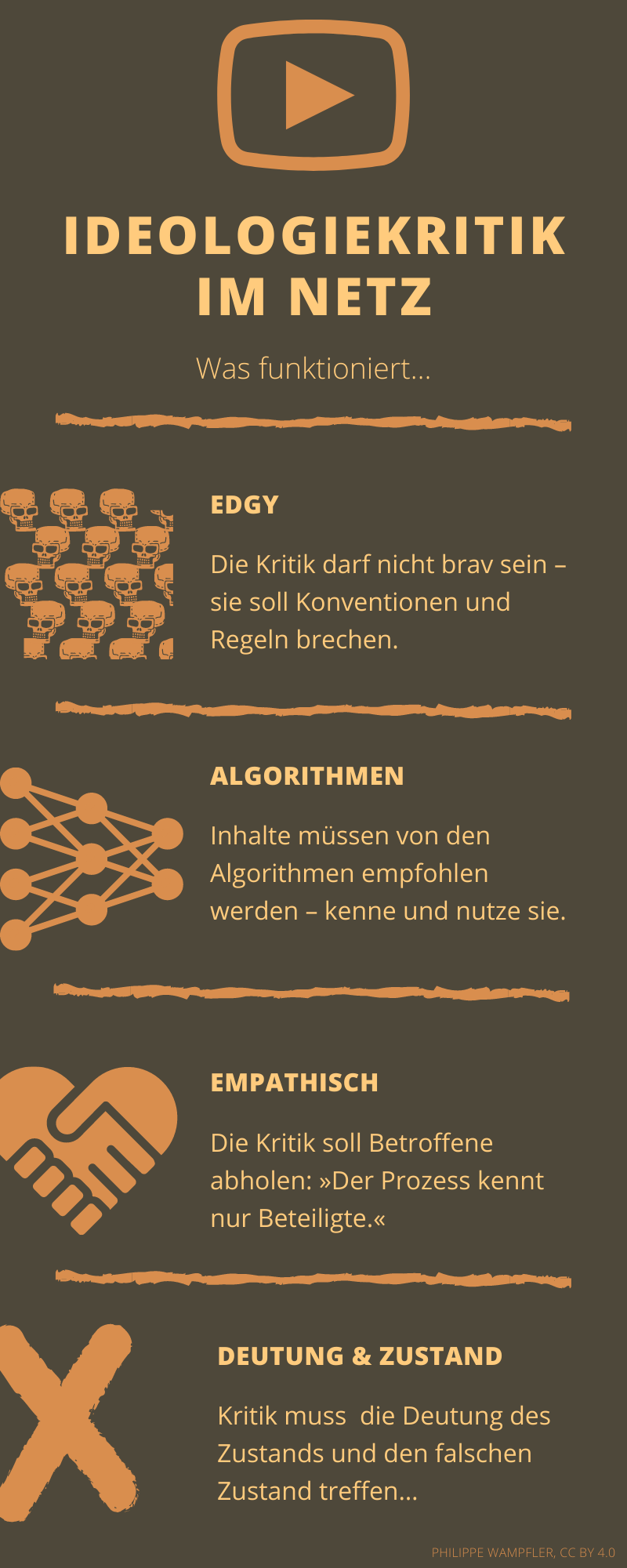 Empfehlungsmechanismen und Anzeigeverfahren haben auf digitalen Plattformen einen entscheidenden Anteil an der Verbreitung von Ideologie. Ideologiekritik muss diese Mechanismen kennen und nutzen, wenn sie wirksam sein will. Sie muss also gleichzeitig ihr Publikum und den Algorithmus bedienen. Das ist ein äußerst komplexer Vorgang, der wenig transparent ist und ständig wechselt.