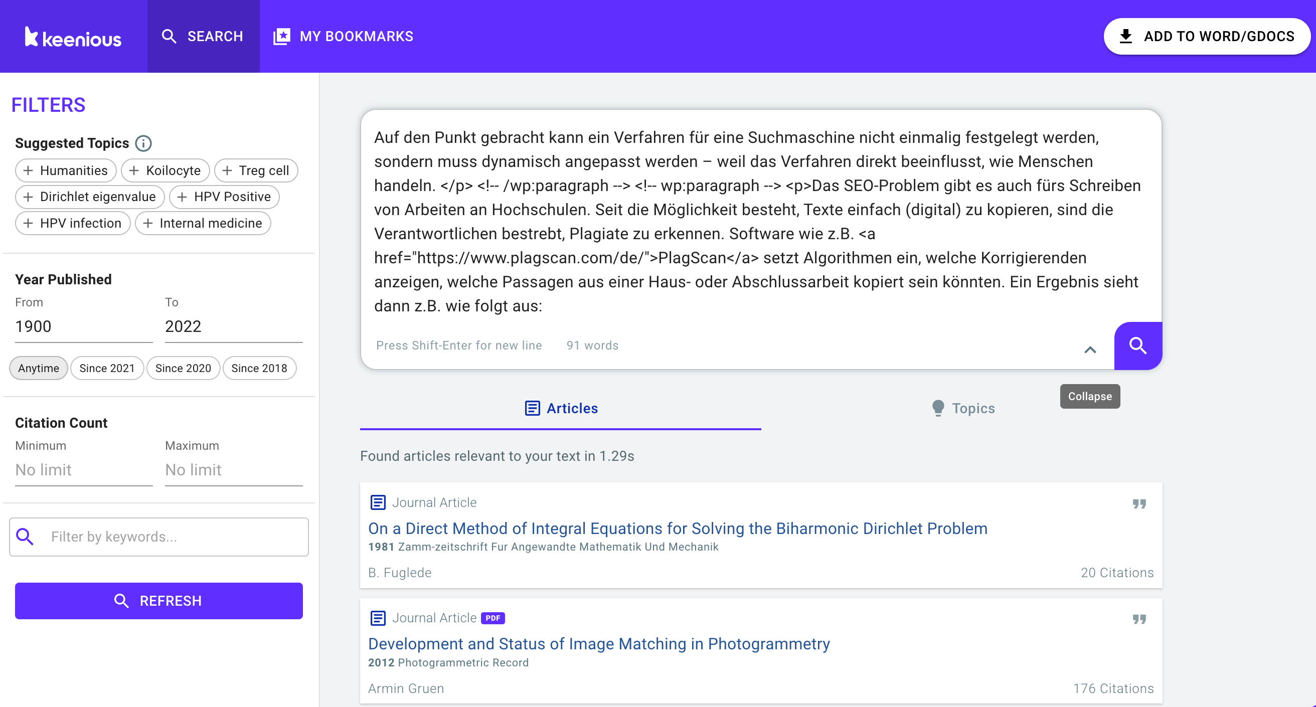 Nach ihrer Integration erscheint sie als Seitenleiste und zeigt für ausgewählte Textpassagen vermeintlich passende Zitate und Quellen an. In der Praxis könnte der Einsatz dieses Werkzeugs dazu führen, dass die eigenständige Literaturrecherche entfällt und weitgehend ungeprüft die vorgeschlagenen Keenious-Quellen gewählt werden. Beim Rewriting bietet Keenious darüber hinaus die Möglichkeit, die vorhandenen Originalquellen mit wenigen Klicks zu ersetzen und damit einen höheren Plagiatsschutz zu erzielen.