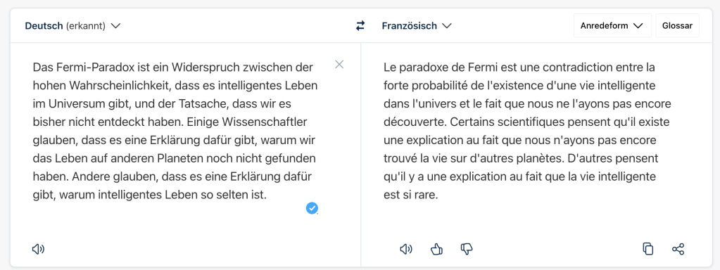 Wenn nun eine Alltags- oder Unterrichtsaufgabe darin besteht, einen Text zu verfassen oder zu übersetzen, dann können Lernende grundsätzlich auf diese Tools zurückgreifen. Ob sie das getan haben oder nicht, lässt sich kaum überprüfen (GPT-3 liefert immer wieder neue Texte zu denselben Inputs, DeepL-Übersetzungen verändern sich von Tag zu Tag).