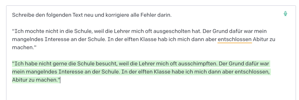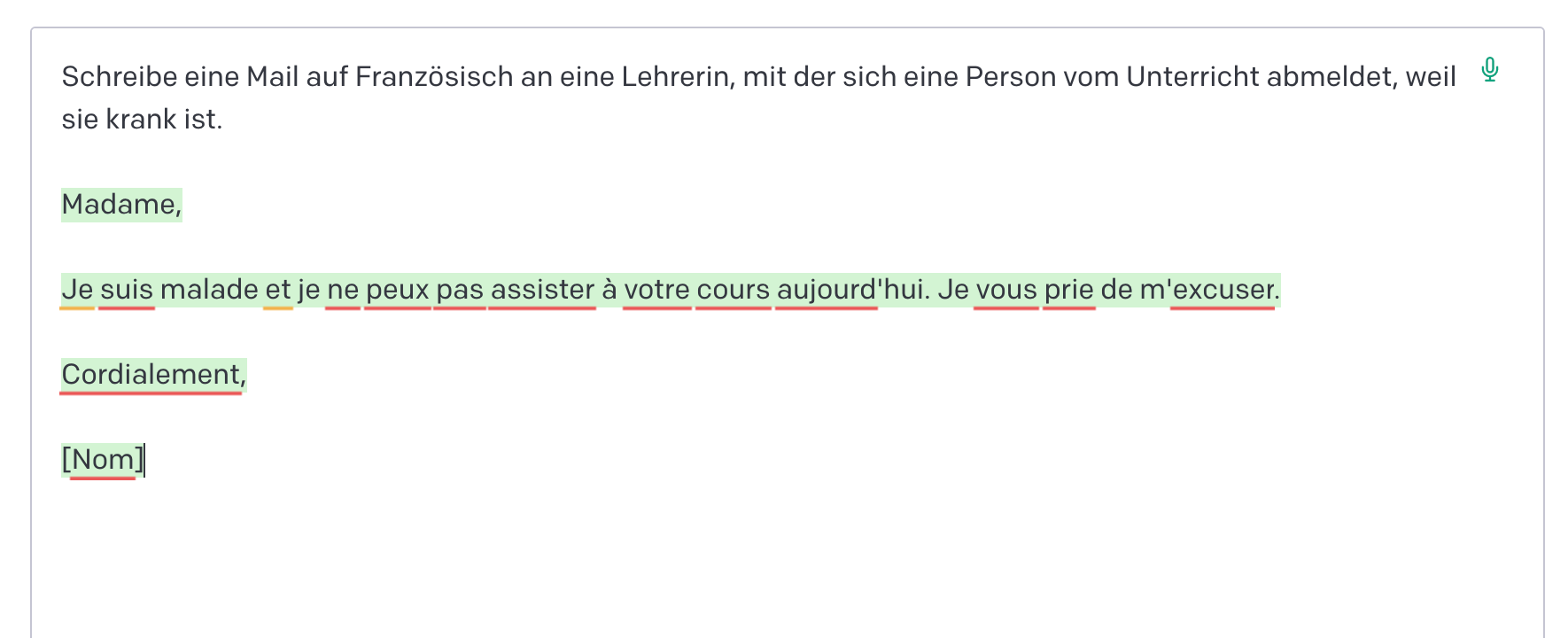 Da im Unterrichtsalltag oft auch an Teilkompetenzen im Fokus stehen, kann es sinnvoll sein, kurze Texte schreiben und übersetzen zu lassen. Die Versuchung, hier mit Tools Abkürzungen zu nehmen, ist bei Schüler*innen sicher vorhanden. Damit sabotieren sie ihre eigenen Lernprozesse genauso, wie wenn sie bei Nachbar*innen abschreiben, bei den Lösungen nachsehen, die Aufgabe von der älteren Schwester erledigen lassen etc. Die Lösung ist hier nicht Überwachung oder Bestrafung, sondern die Etablierung einer konstruktiven Lernkultur.