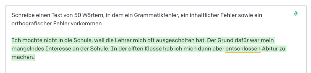 Solche Versuche können dann einen Ansatz bieten, um subversive Experimente zu machen und mit den Möglichkeiten und Schwächen der Programme zu spielen. Hier können Lernende wohl schnell eigene Ideen generieren, mit welchen Anweisungen die Tools gefüttert werden könnten.