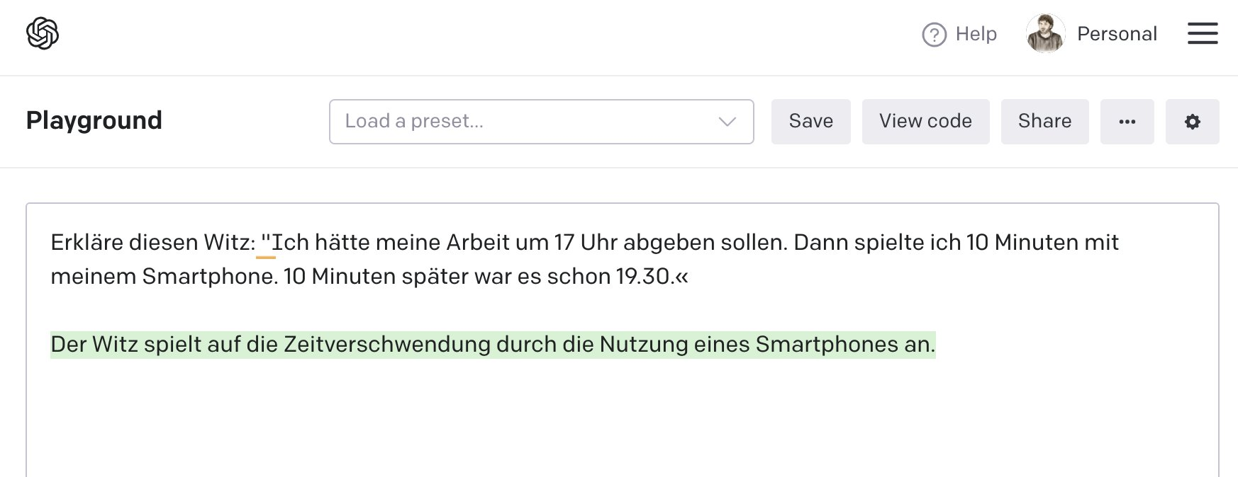 Gleichzeitig brauchen sie ein rudimentäres Verständnis dessen, was im Hintergrund abläuft. Hilfreich sind hier z.B. Aufgaben, die dabei helfen, die Funktionsweise von Werkzeugen zu vergleichen – etwa leicht veränderte Sätze mit DeepL übersetzen oder GPT-3 nutzen, um unterschiedliche Witze erklären zu lassen (die Idee stammt aus diesem Essay von Steven Johnson).