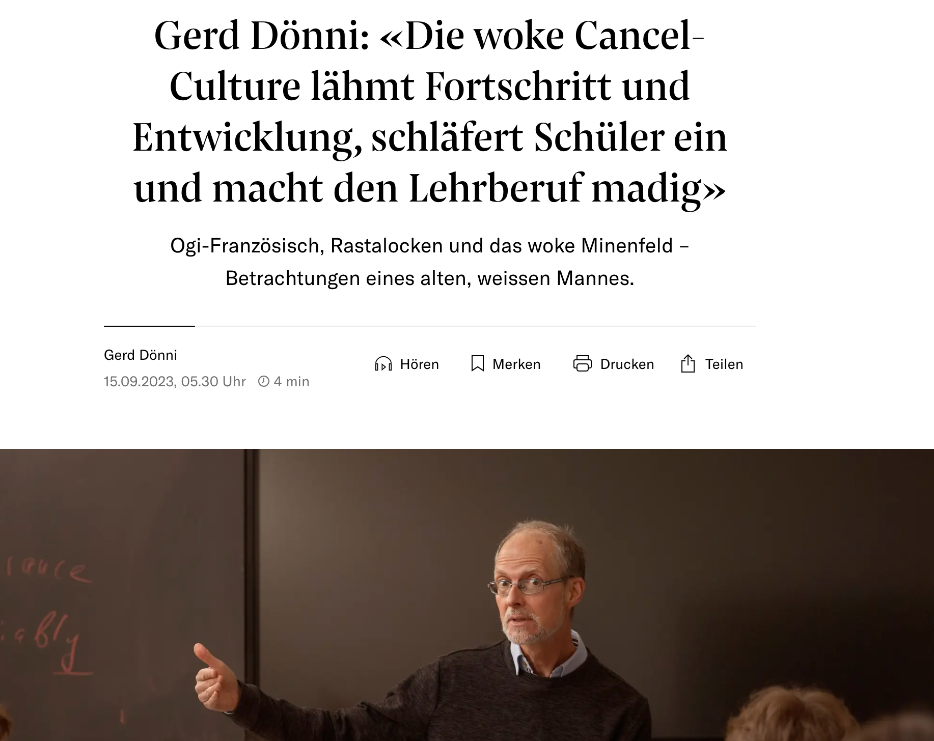 Wenn wir wirklich an Toleranz glauben, an Respekt, an Kultur und an wissenschaftlichen Fortschritt, dann finden wir Wege, Gymnasien zu guten und gerechten Orten für alle zu machen. Wir müssen solchen Anliegen nicht die Legitimation absprechen, indem wir sie schematisch als Verbotskultur bezeichnen. Genauso müssen wir heute nicht so handeln, sprechen oder schreiben, wie wir das früher gelernt haben. Schüler*innen und Kolleg*innen mit Anliegen müssen wir weder mit einem Label verstehen noch als Teil einer problematischen Ideologie sehen, wir können sie einfach ernst nehmen. Sie sind ein wichtiger Teil jeder Schule, für mich der wichtigste. Sie als Problem darzustellen, ist unfair und auch feige, Gerd. Das Privileg, in der NZZ deine Ansichten ausbreiten zu können, hättest du besser nutzen können, als engagierten Menschen das Leben schwer zu machen.