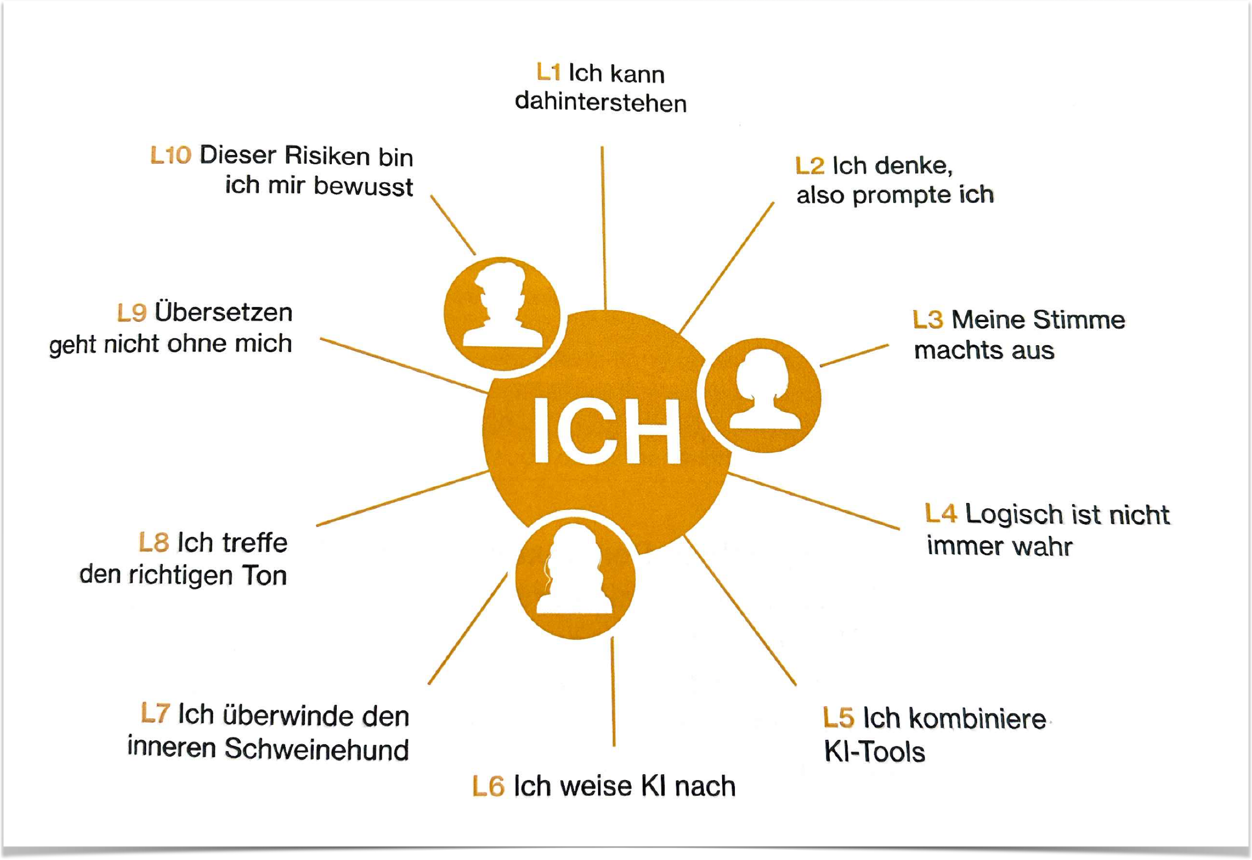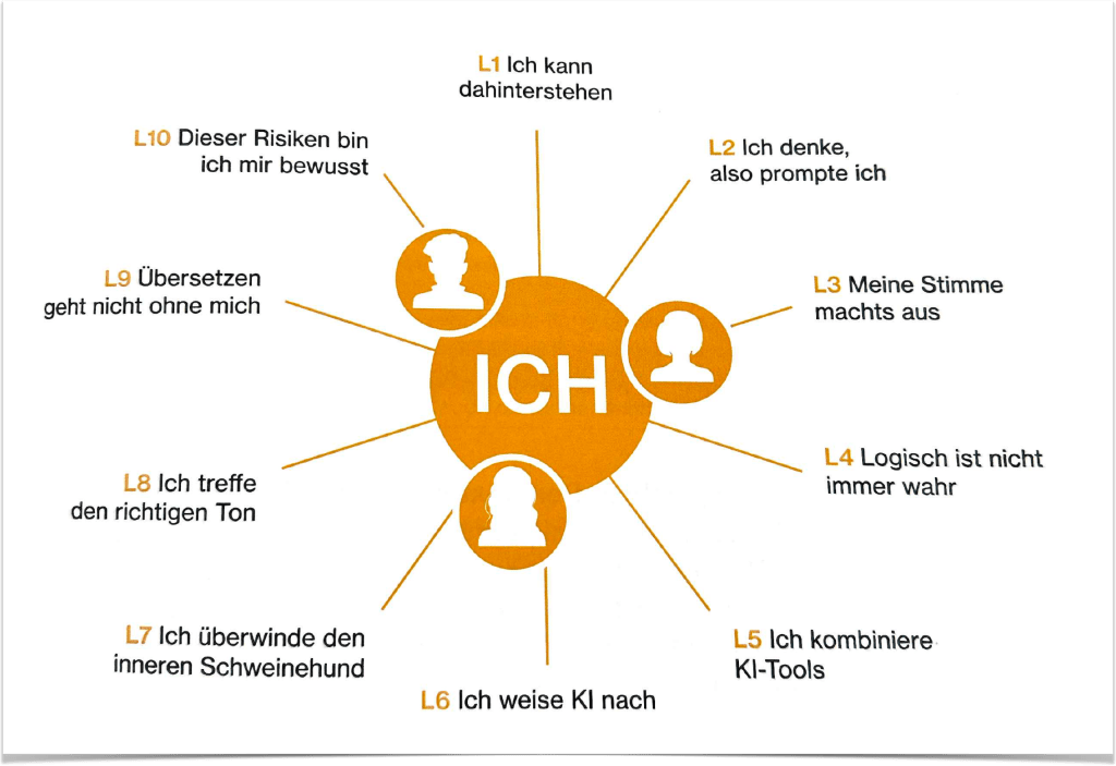 Was bedeutet das nun für solche längeren schriftlichen Arbeiten? Wie sollten wir als Verantwortliche und als Betreuer:innen damit umgehen? Die Frage würde ich mit einer Darstellung beantworten, welche aus dem KI-Buch von Sara Aloatti und Filomena Montemarano stammt. Die Autorinnen stellen dabei das Ich der Schülerin oder des Schülers in den Mittelpunkt: