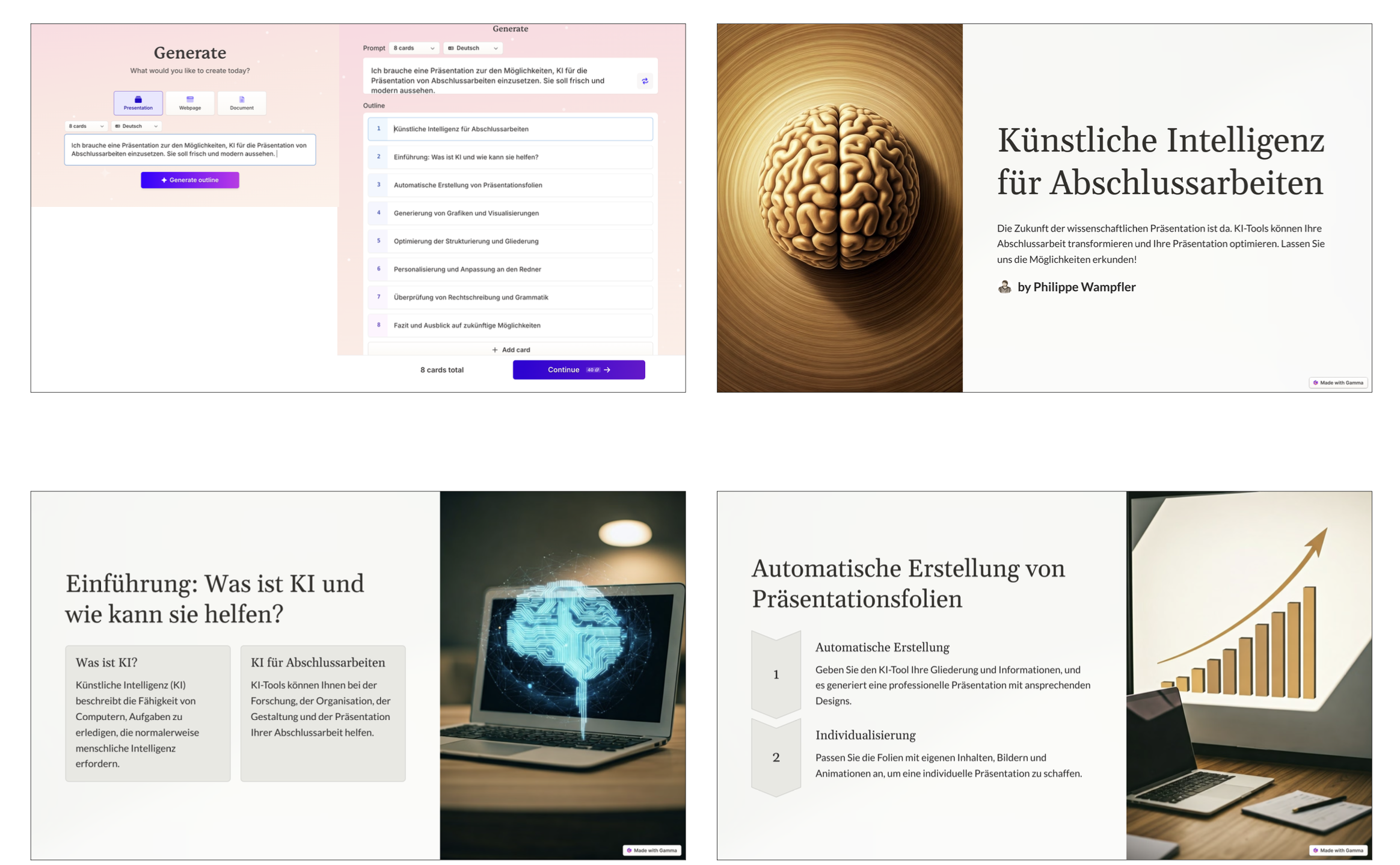 (3) Zudem können Anwendungen wie gamma.app problemlos ganze Präsentationen generieren, die hervorragend aussehen. Auch hier ein Eindruck der Ergebnisse: