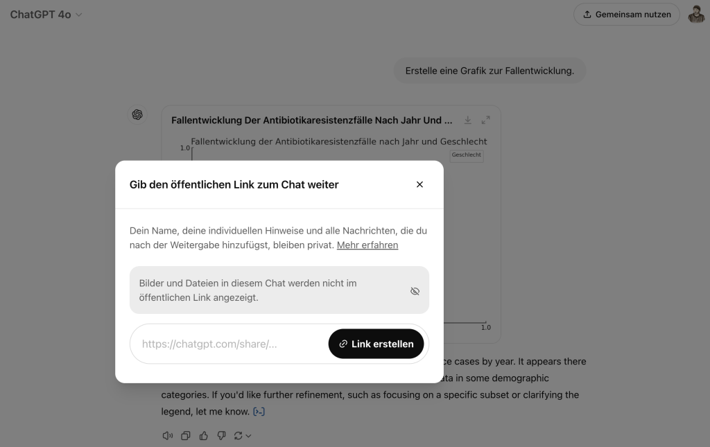 Eine Möglichkeit ist, die Nutzung zu beschreiben oder Prompt-Journale zu hinterlegen. Viele Tools erlauben es Nutzer:innen, Links zu generieren, mit denen die Anfragen und Antworten eingesehen werden können.