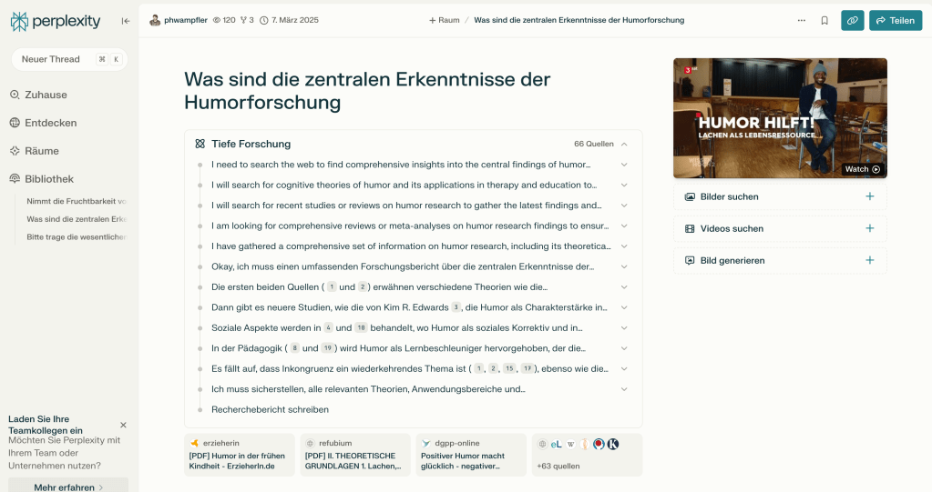 (1) Die «Deep Research»-Funktionalität (eine Einführung habe ich hier vorgenommen) der wichtigsten KI-Applikationen schreibt eine Art Forschungsplan für eine Maturitätsarbeit, sucht Quellen und schreibt fokussiert ganze Kapitel inklusive Forschungsbezüge. Im Screenshot sieht man Perplexity: