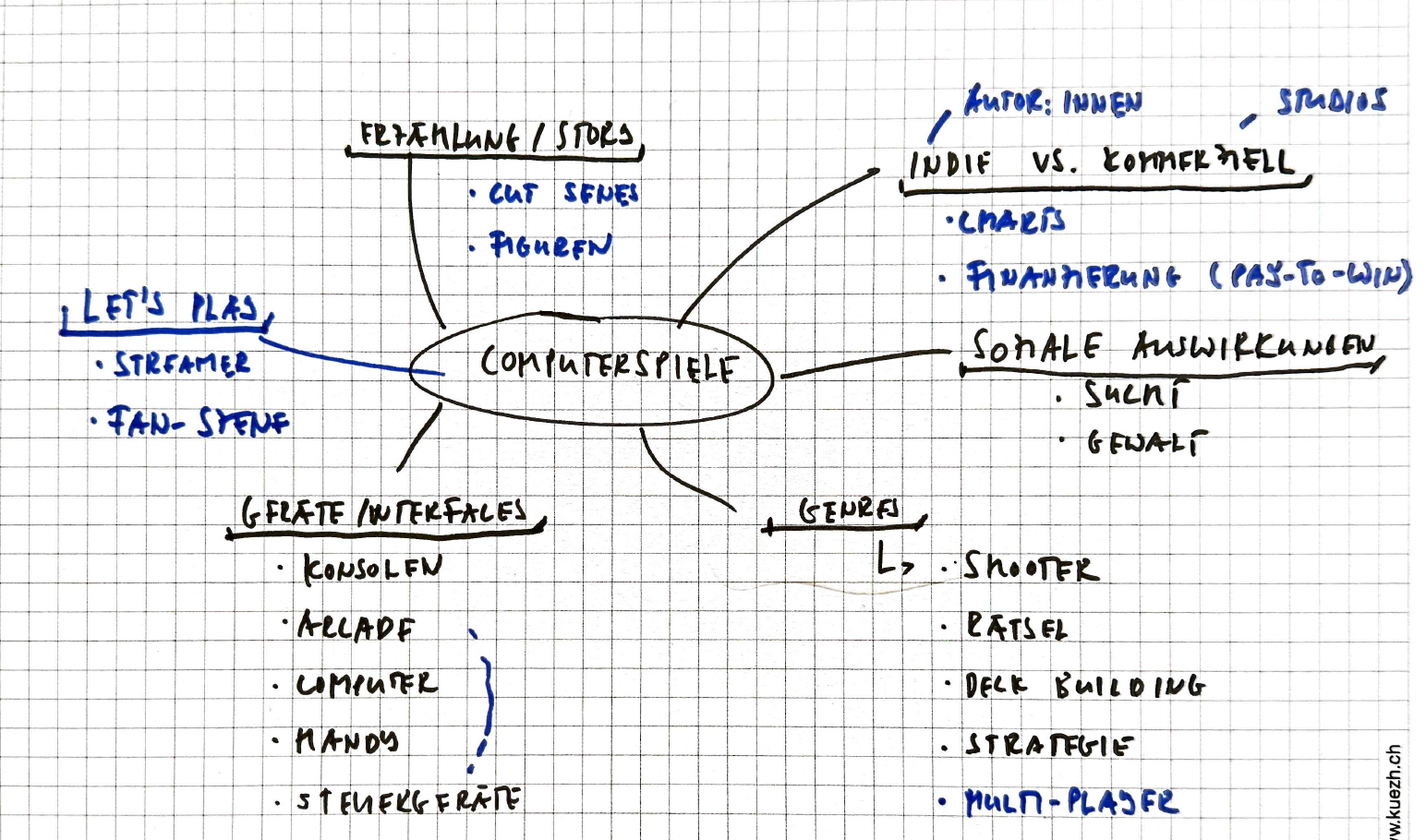 - Die Schüler:innen erfahren auch Beschränkungen und Bias der KI, weil sie in zwei Schritten schon vor der Arbeit mit den Tools Wissen strukturiert haben. Bei meiner Arbeit an einem Mindmap zu Computerspielen sind einige Aspekte in den KI-Antworten nicht aufgetaucht, auf die ich zuvor schon gestossen bin.