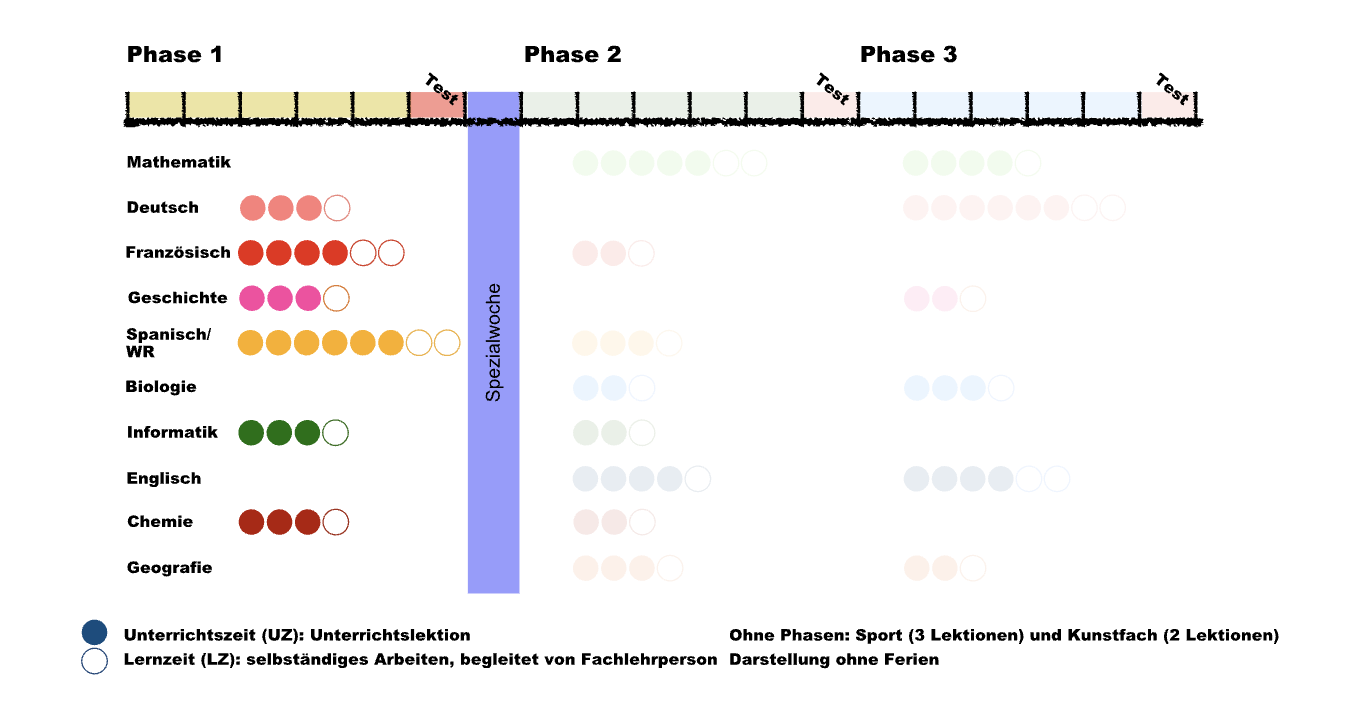 - In vielen Kantonen gibt es Gymnasien, die Phasenunterricht (mit unterschiedlichen Namen) eingeführt haben. Gemeint ist damit ein Stundenplanwechsel nach einigen Wochen. Während diesen durch den Wechsel abgegrenzten Phase sind die Fächer doppelt so stark vertreten wie sonst – aus Zweistundenfächern werden Vierstundenfächer.