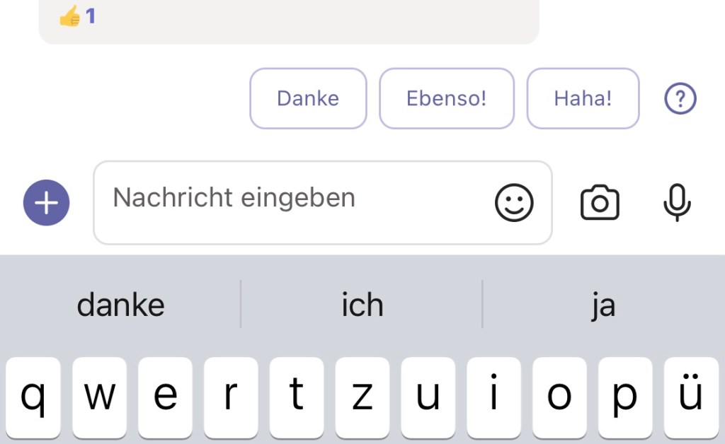 (Der Screenshot zeigt eine Doppelung – offenbar denkt auch iOS, das Betriebssystem meines Mobiltelefons, dass »danke« eine gute Antwort sein könnte und schlägt sie mir als Wort vor.)