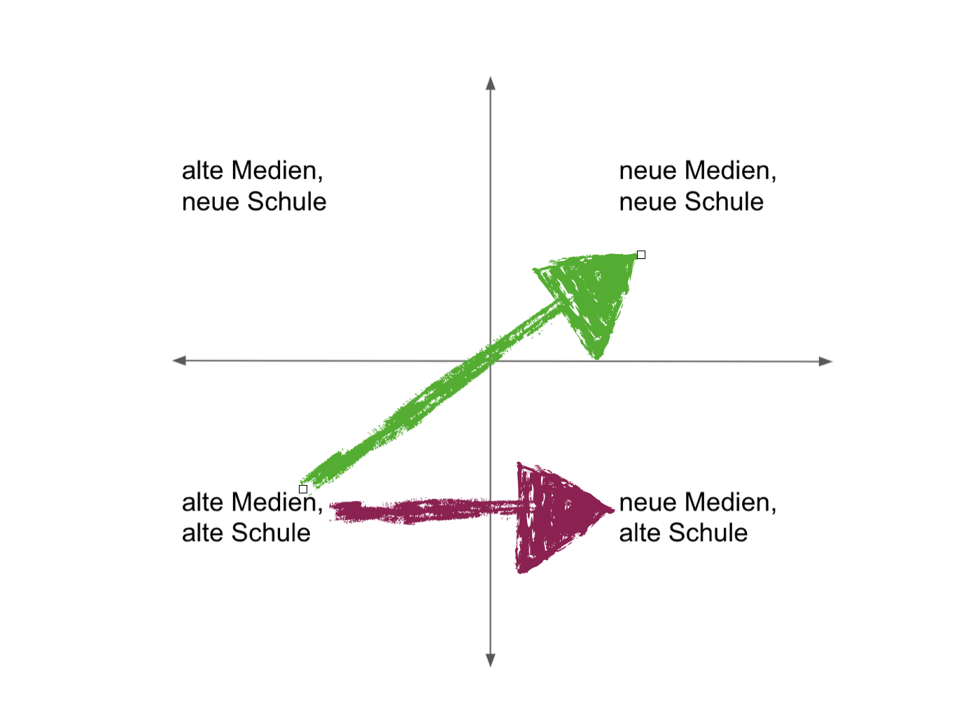 Ausgangspunkt meiner Gedanken ist der lesenswerte Essay von Jöran Muuß-Merholz zur Frage, ob digitale Medien an Schulen als Katalysator, Trojaner oder Verstärker wirken. Im Schlussabschnitt entwirft er vier Quadranten, in denen Schulen angesiedelt werden können. Er merkt an, dass oft implizit vom grünen Pfeil der Schulentwicklung ausgegangen wird, während der rote in der Praxis oft auch vorkommt: