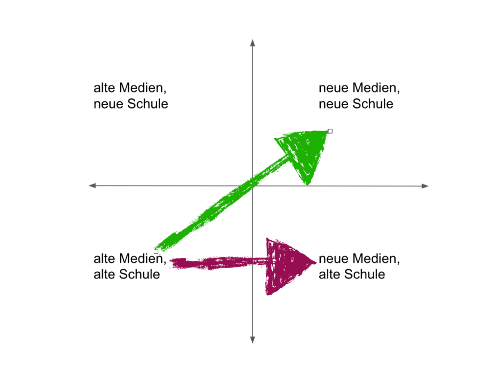 Das SAMR-Modell, die Trojaner- und die Katalysator-These setzen eine Verschiebung in Richtung „neue Medien“ – in der Regel stillschweigend – mit „neue Schule“ gleich. In der oberen Grafik würde das einer Bewegung als Pfeil von unten links nach oben rechts entsprechen. Das entpuppt sich als Kurzschluss. Denn auch die alte Schule kann mit neuen Medien optimiert werden. Es zeigt sich, dass digitalen Medien sehr gut für frontale Belehrung, Vereinzelung der Lernenden, starke Strukturierung und enge Kontrolle genutzt werden können.