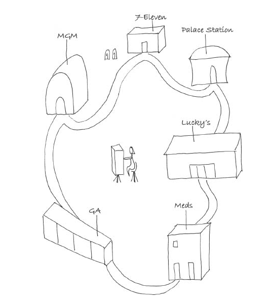 Schüll hat in Las Vegas geforscht. Die Spielindustrie hat die Bevölkerung der Stadt längst als Einnahmequelle entdeckt: Zwei Drittel der Ansässigen spielen regelmäßig, wiederum zwei Drittel davon können als abhängig bezeichnet werden. Die Menschen, die Schüll zu Wort kommen lässt und deren Sucht sie interessiert, spielen nicht in den protzigen Casinos. Das Spiel ist fest in ihren Alltag integriert, wie die Karte zeigt, die Mollie für die Autorin gezeichnet hat. Die Spielsüchtige arbeitet im Hotel des MGM-Casinos. Auf der Heimfahrt tankt sie oft bei 7-Eleven – und spielt dort gleichzeitig. Beim oben abgebildeten Supermarkt »Lucky’s« kauft sie ein, am Wochenende spielt sie im Palace-Station-Casino. Die unteren beiden Station zeigen die Hilfe, die sie bezieht: Die Medikamente, die sie in der Apotheke holt, sowie das »Gamblers Anonymous«-Meeting, wo sie ihre Sucht zu therapieren versucht.
