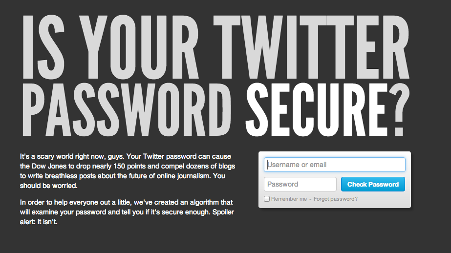 Auf dieser Idee basiert die Seite, mit der man Medienkompetenz vermitteln kann. ismytwitterpasswordsecure.com gibt vor, dass man mit ihrer Hilfe überprüfen kann, wie sicher das eigene Twitter-Passwort ist. Liest man den Text durch, fällt der letzte Abschnitt auf, der das Resultat vorwegnimmt: Das Passwort ist nicht sicher genug.