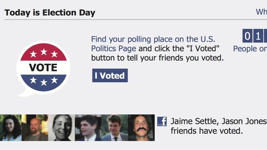 Worum ging es im Experiment? Mit einem eingeblendeten Banner wurden rund 60 Millionen aufgefordert, wählen zu gehen – und zwar bei den Kongresswahlen 2010 in den USA. Sie sahen zudem auch Freunde, die bereits abgestimmt haben und konnten auf einen Link klicken, mit dem sie wiederum Freunden zu verstehen geben konnten, dass sie abgestimmt haben, wie auf dem Bild erkennbar ist. Je rund 600’000 Facebook-User sahen entweder nur das Banner (ohne Freunde) oder nichts – das die beiden Kontrollgruppen.