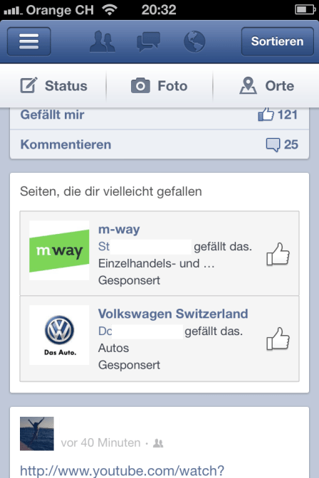 Interessant ist, dass Facebook selbst am Experiment beteiligt war – und die Erkenntnisse von Fowler in seinen neuen mobilen Werbeeinblendungen gekonnt nutzt. Dort werden nämlich Werbeseiten angezeigt, die von FB-Freunden ein »like« bekommen haben – als handle es sich um einen regulären Eintrag im Facebook-Stream.