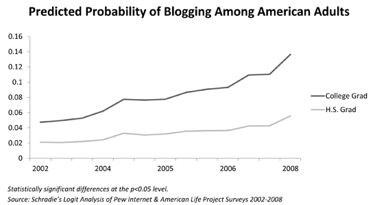 Der Mythos besagt, dass die Jungen von heute keine Kluft mehr kennen, nur alte Menschen, die nicht Digital Natives sind. Schradies Untersuchungen zeigen, dass das nicht stimmt. So hat sie z.B. erforscht, wie wahrscheinlich es ist, dass High-School-Absolventinnen und -absolventen bloggen und das mit College-Ausgebildeten verglichen: