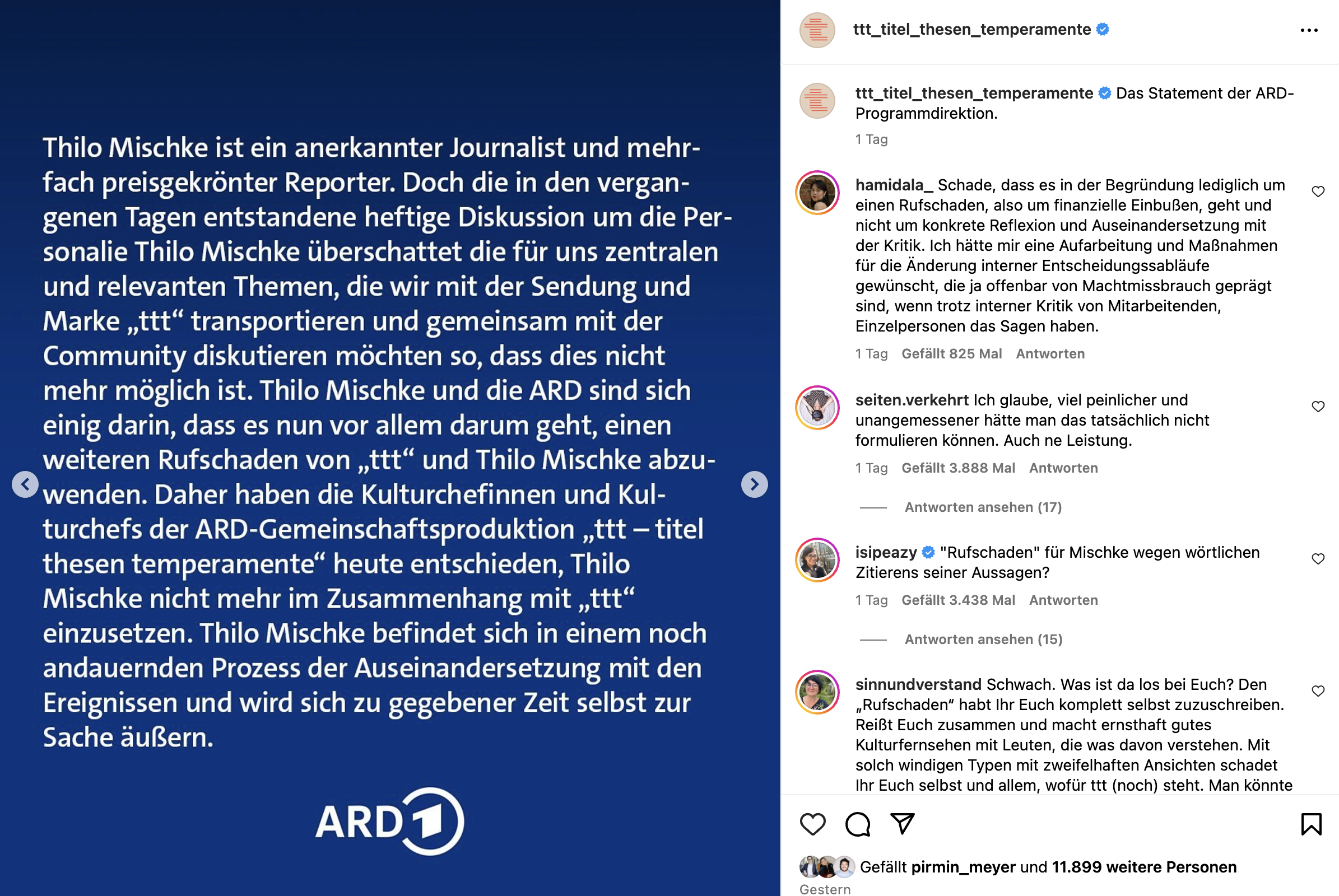 Die ausgebildeten Journalist:innen beim ARD machen in ihrer Reaktion auf die Kritik an der Anstellung von Mischke genau das. Sie sprechen von einem «Rufschaden» und einer «heftigen Diskussion», die «relevante Themen» «überschatte». Das ist sehr schade: Gerade die Redaktion von TTT hätte erkennen können, dass die Diskussion ein relevantes Thema ist, das sie ganz leicht hätte ins Produktive wenden können. Das gilt auch für Mischke: Dass er nicht sofort verzichtet hat, lässt sich für mich nicht erklären, noch weniger aber verstehe ich, weshalb er die Vorwürfe nicht als sachliche Kritik aufgenommen und darauf geantwortet hat.