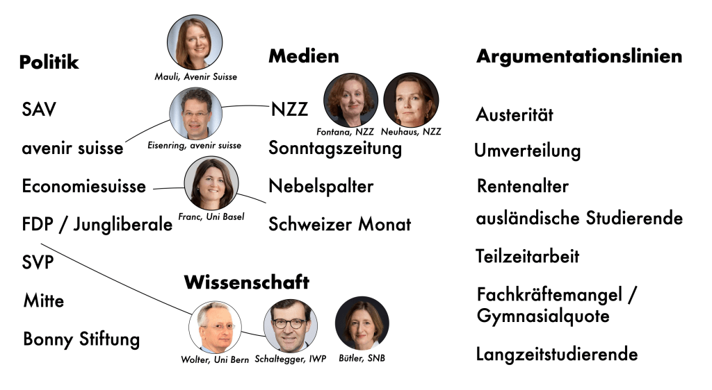 Die nächste Diskursschleife wird von Andrea Franc eingeleitet. Die Historikerin hatte für Economiesuisse gearbeitet. Sie nimmt eine Argumentationslinie auf, die sich schon bei Wolter/Wunsch findet: Studierende würden von Ausgaben profitieren, die «Arbeiter:innen» tätigen würden. Franc spitzt dieses Argument so zu, dass es besonders Geisteswissenschaftler:innen trifft, die ihren Schilderungen gemäss im Studium wenig leisten würden. Franc schreibt bereits 2021 im Schweizer Monat und in der NZZ am Sonntag (💰) über das Thema. Breit rezipiert werden ihre Thesen aber erst nach einem Interview, das Katharina Fontana und Christina Neuhaus für die NZZ führen (💰). Franc verbindet darin verschiedene Argumentationslinien, insbesondere geht sie nicht nur auf Umverteilung ein, sondern spricht auch die Altersvorsorge an und stellt in den Raum, dass in der Schweiz zu viele Geisteswissenschaftler:innen ausgebildet würden: