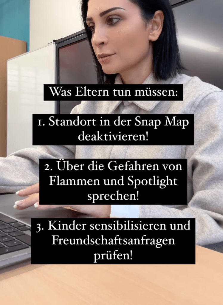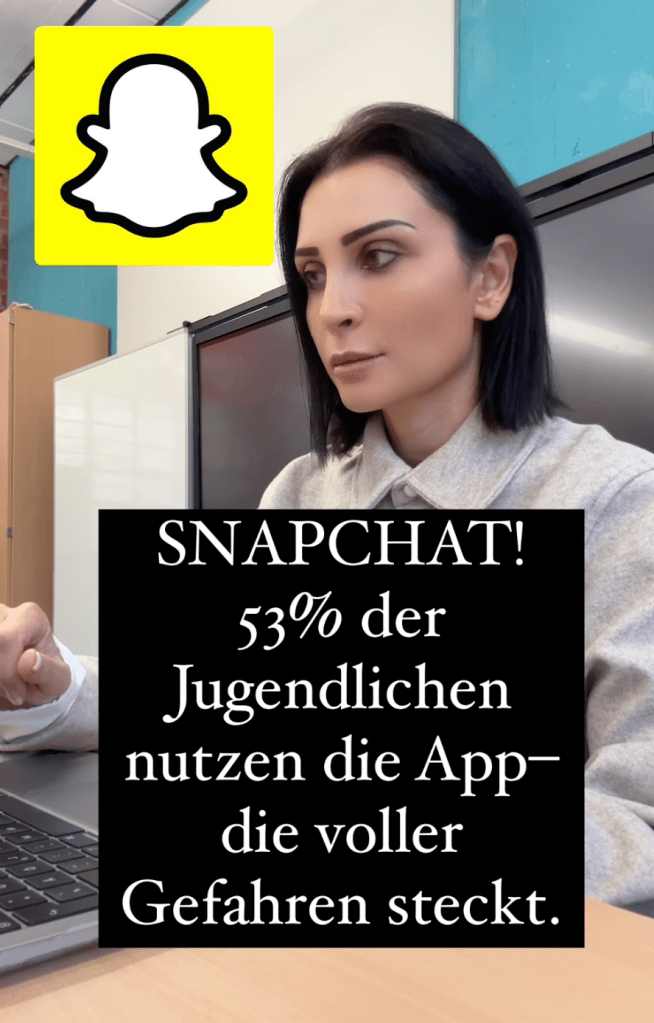 Wo liegt das Problem? Ist doch gut, könnte man meinen, wenn Eltern «sensibilisiert» werden für das, was ihren Kindern möglicherweise passiert. Ich zeige es an einem Beispiel, das auch als Illustration für diesen Beitrag dient: Hilal, über deren Rolle auf Instagram ich bereits vor ein paar Jahren einmal geschrieben habe, warnt aktuell in ihren Reels auf Instagram vor Snapchat – z.B. hier. Snapchat, so der Titel ihres Reels, sei «die gefährlichste App für Kinder». Das begründet sie wie folgt: