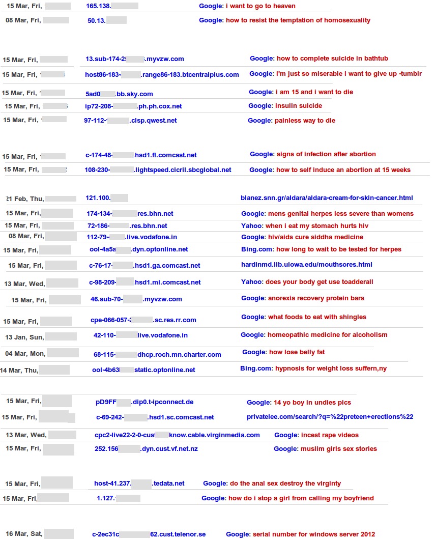 Die Suchanfragen im Beispielbild sind alle problematisch; sie weisen auf Suizidversuche, Kinderpornografie, Übergewicht, Magersucht, Softwarepiraterie etc. Die Tracker vermitteln diese Informationen nicht nur an Betreiber von Seiten (denen man das Recht ja zusprechen könnte, zu wissen, wie die Seite gefunden wird), sondern sie veröffentlichen diese Informationen auch (und verkaufen sie). Man kann sich hier live ansehen, wie so eine Seite aussieht. Eine Liste mit Tracking-Diensten findet sich hier. Wichtig ist anzumerken: Unsere Suchanfragen werden nicht komplett veröffentlicht, sondern nur, wenn sie uns auf Seiten geführt haben, die Suchanfragen tracken.