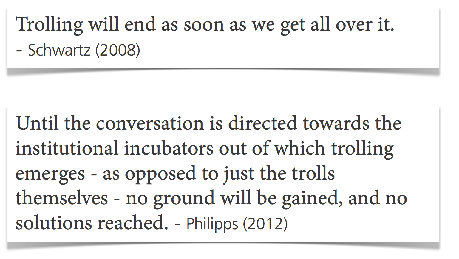 Die klassischen Trolle bei 4chan gaben als ihre Absicht an, lulz erzeugen zu wollen – ein schadenfreudiges digitales Lachen. Diese Absicht scheint mir aber für Trollverhalten nicht nötig zu sein: Wie Kathy Sierra, selbst Opfer massivster Troll-Übergriffe, in einem lesenswerten Blogpost schreibt, gibt es durchaus Trolle, die hehre Absichten verfolgen.