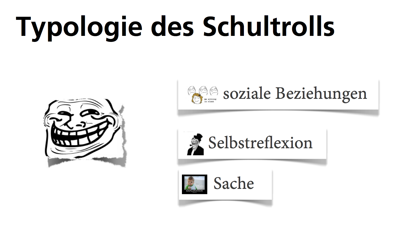 In einem Aufsatz über Trolle in der Schule (pdf) habe ich vier Ebenen unterschieden, die nötig sind, um trolliges Verhalten zu beschreiben:
